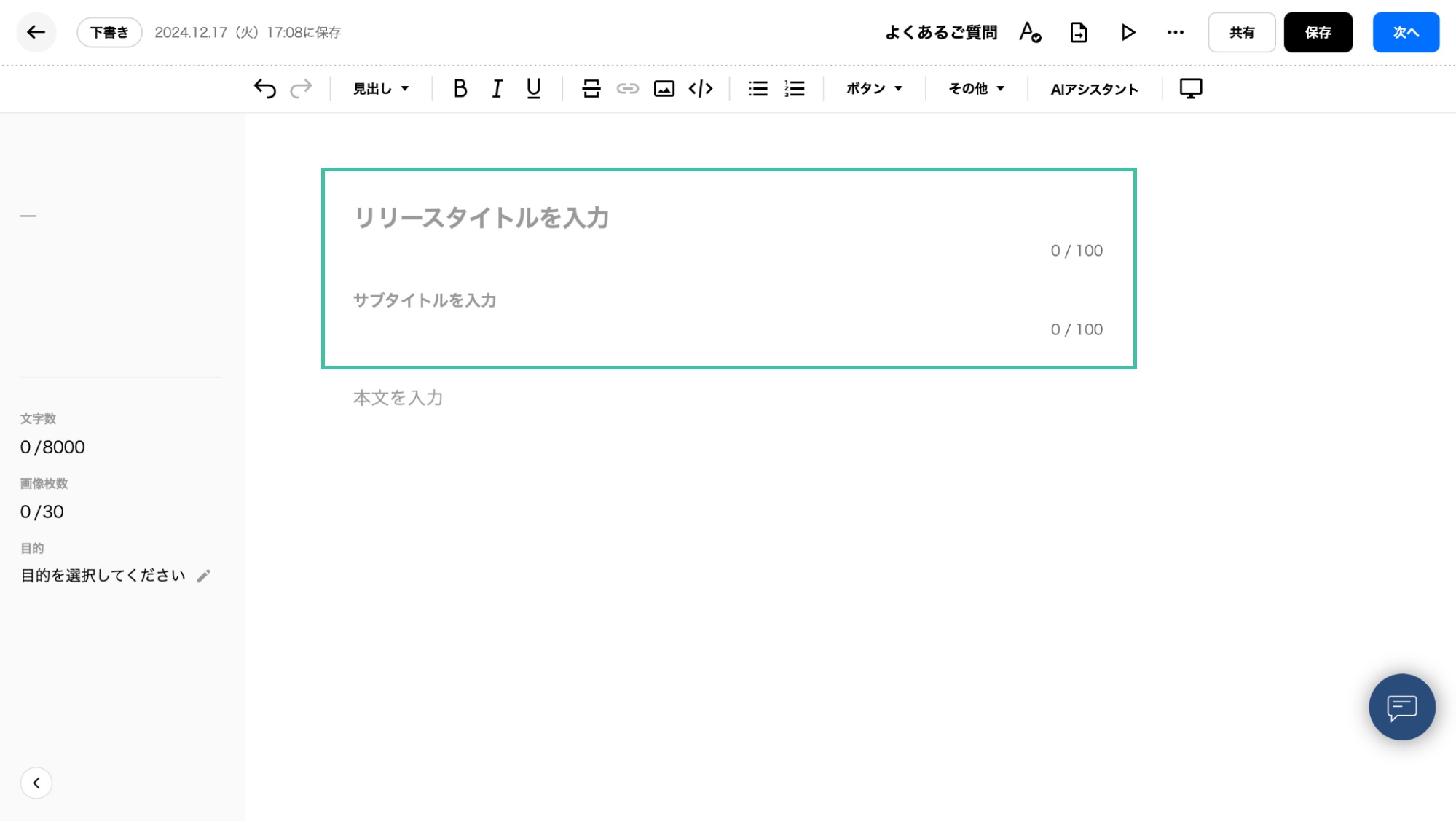 編集ページの上部からリリースタイトル、サブタイトルをそれぞれ100文字以内でご入力いただけます。リリースタイトルは必須入力です。