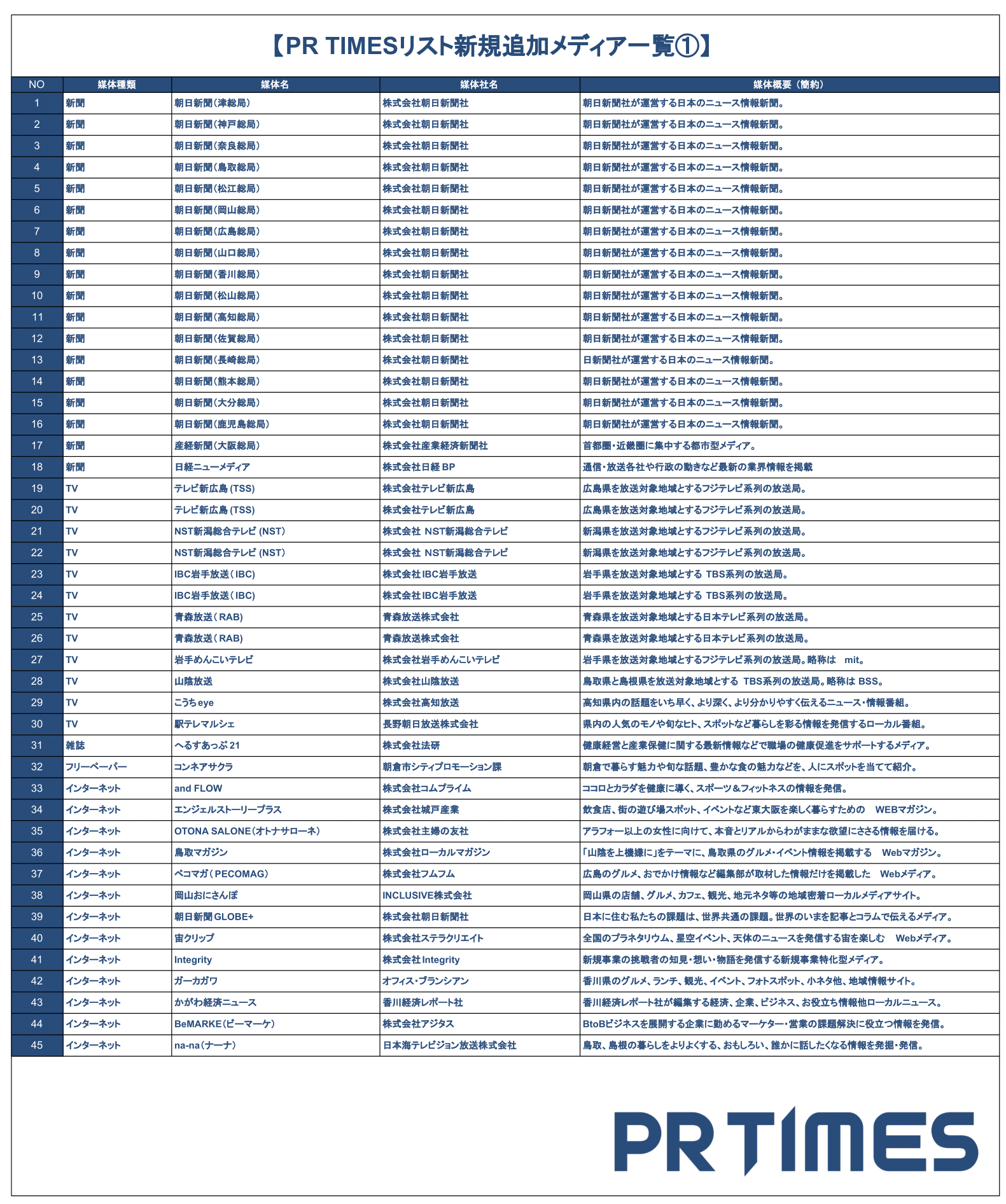 メディアリストへ追加をご希望のメディアがある際は、 media.cr@prtimes.co.jp までご連絡ください。
