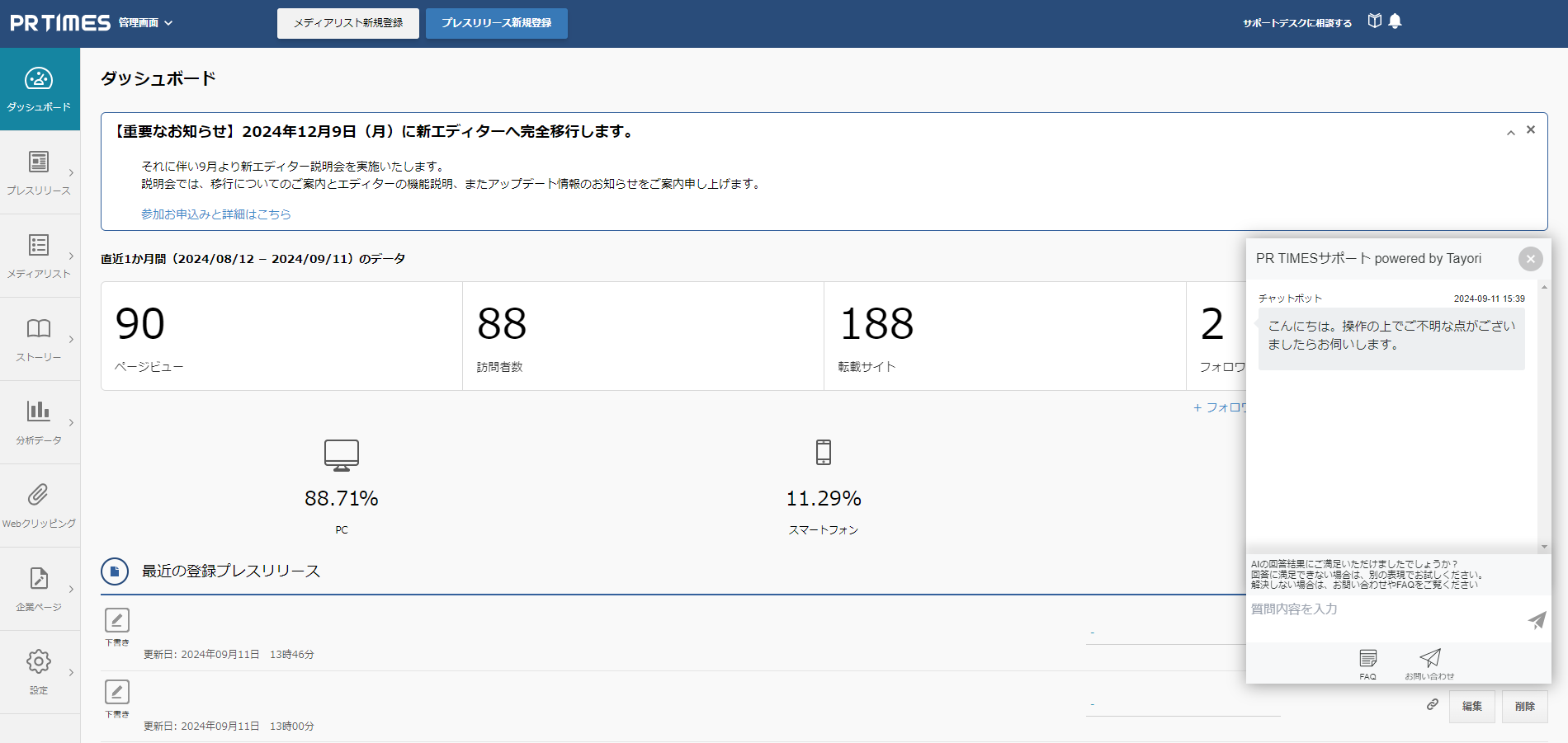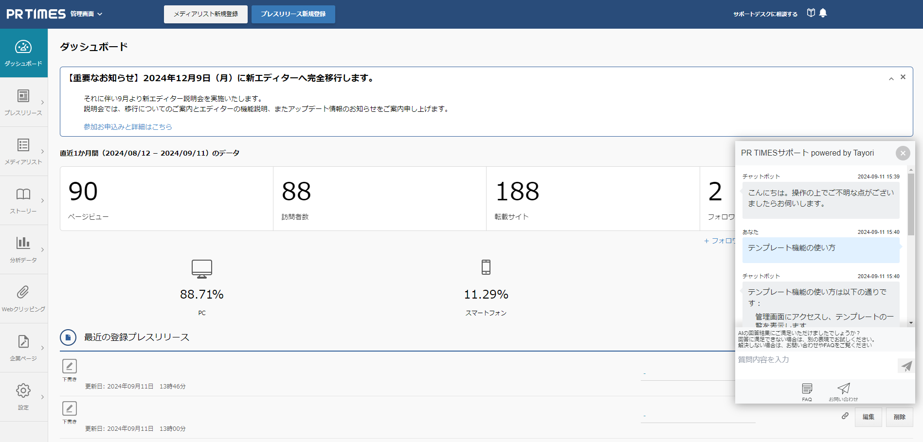 AIチャットボットはPR TIMES社が運営するカスタマーサポートツール「Tayori」がβ版で提供している新機能です。