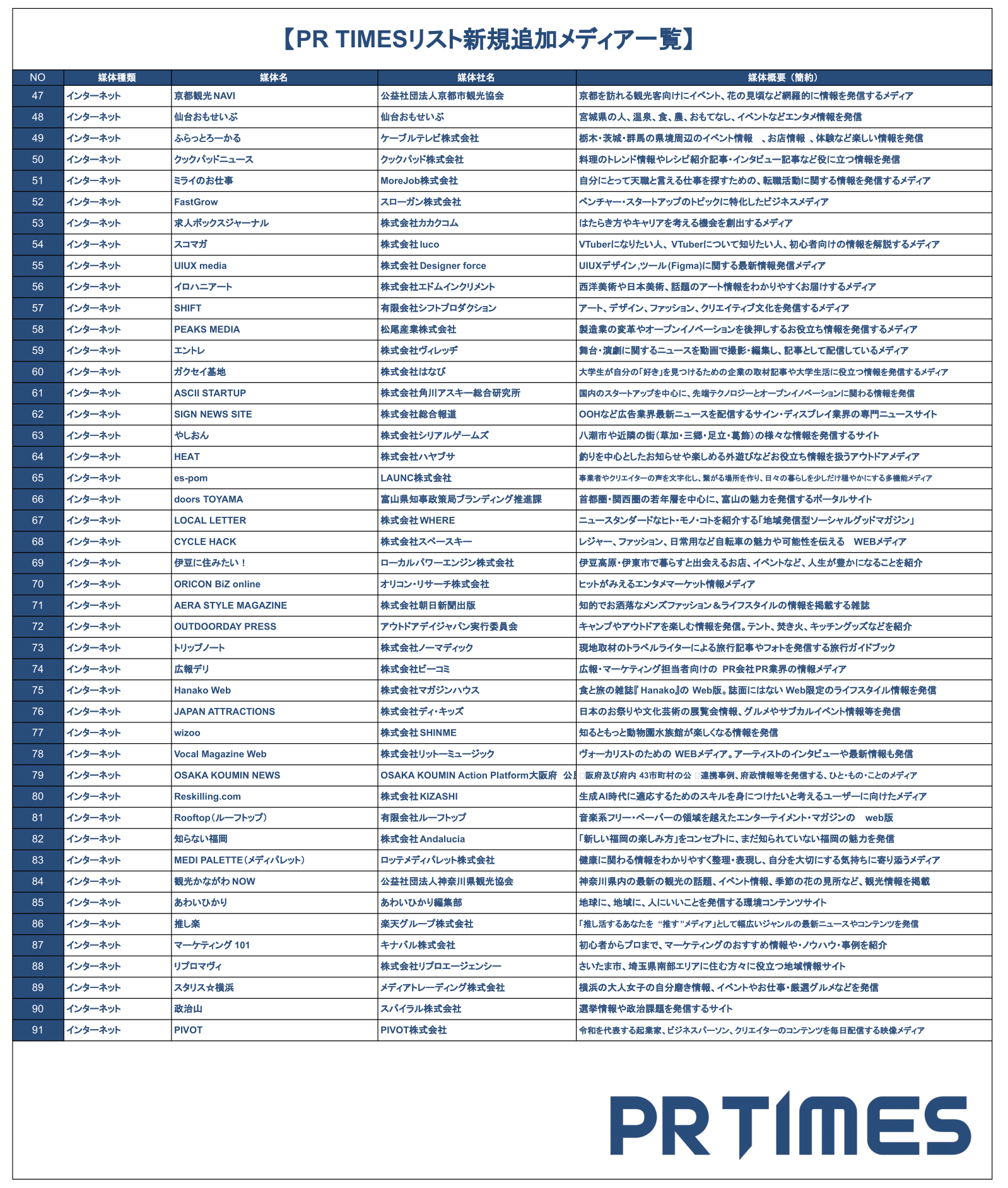 PR TIMESのデータベースにあるPR TIMESリストに、新たに91媒体を配信先メディアとして追加しました。(2024年8月時点)
