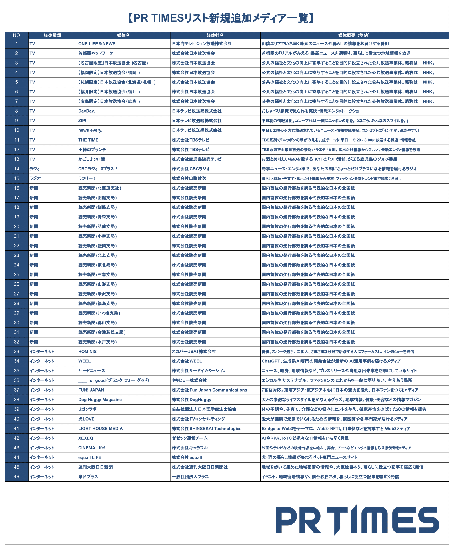 添付画像で詳細をご確認いただき、新規追加メディアへのプレスリリース配信もご検討ください。なお、メディアの編集や方針変更等により配信を停止、または配信手段が変更となる場合がございます。予めご了承ください。