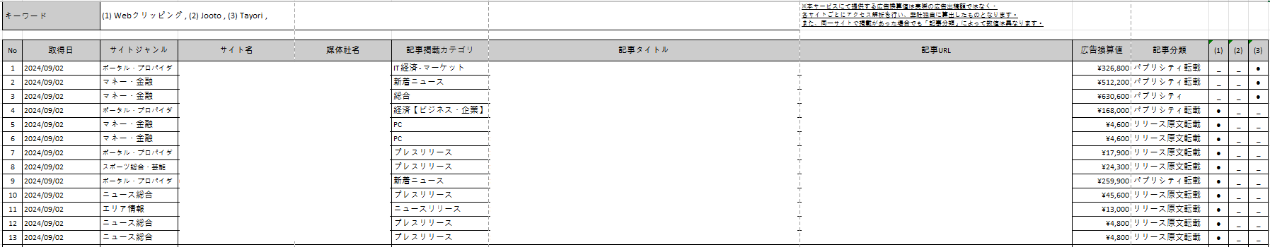 下記、エクセルでダウンロードしたレポートのイメージ画像になります。(※サイト名や媒体社名等、非表示部分につきましても、実際にクリップ調査をご利用いただいた際にはご覧いただけます。)