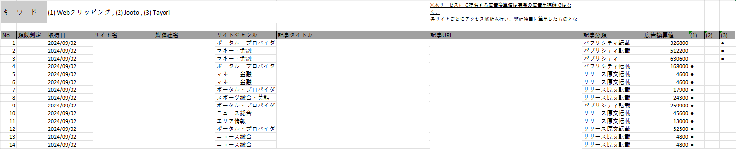 「類似判定」「取得日」「サイト名」「媒体社名」「サイトジャンル」「記事タイトル」「記事URL」「記事分類」「広告換算値」「記事を収集したキーワード」