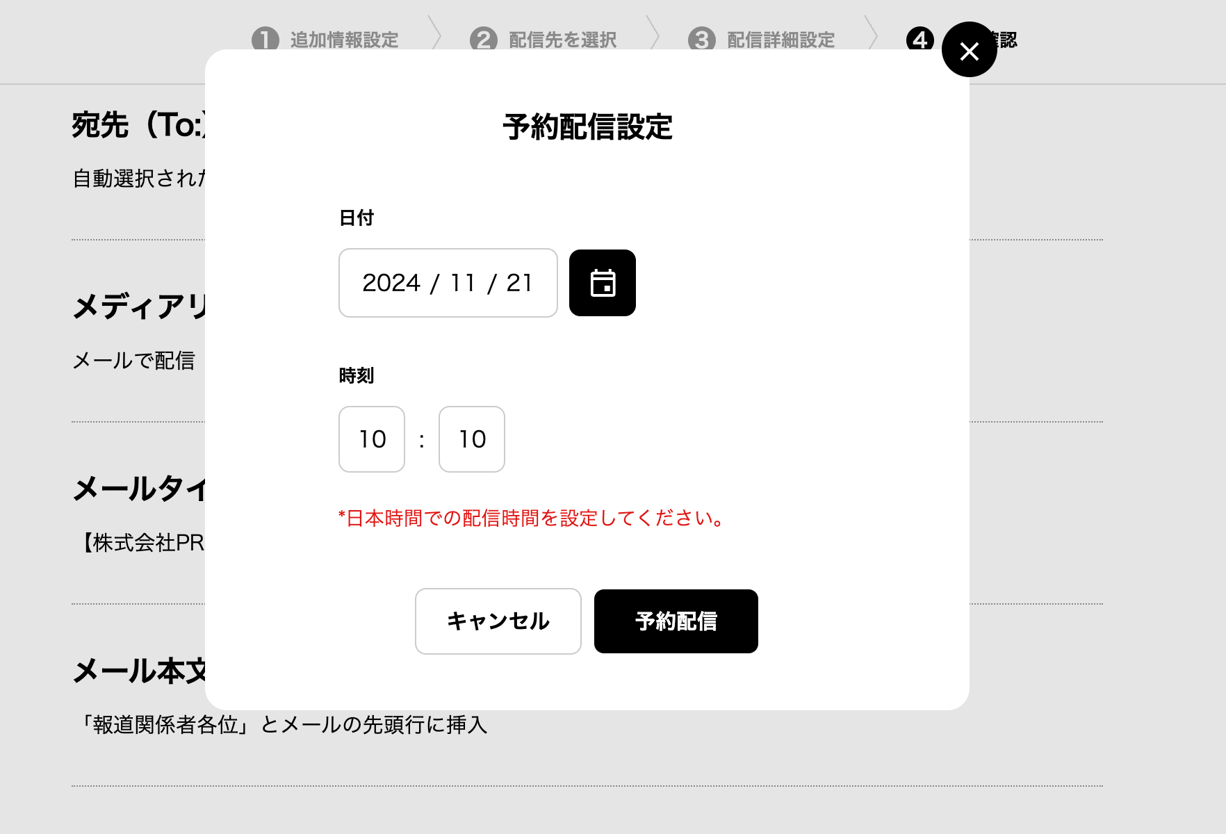 例として、「11月21日 10時10分」に配信予約を設定した場合、日本時間の「11月21日 10時10分」に配信がされます。
