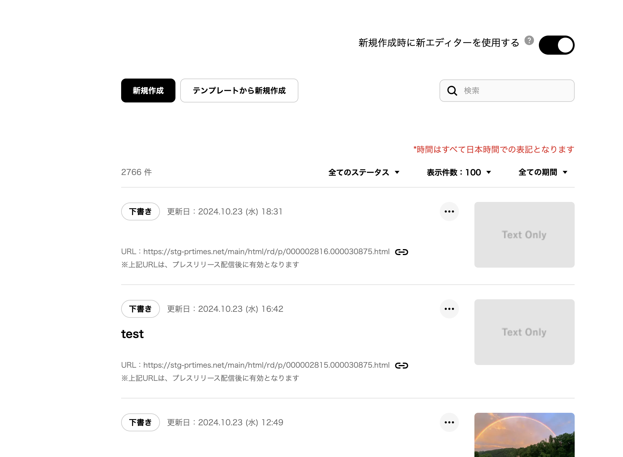 プレスリリース一覧画面において表記されている時間は、すべて日本時間での表記となります。