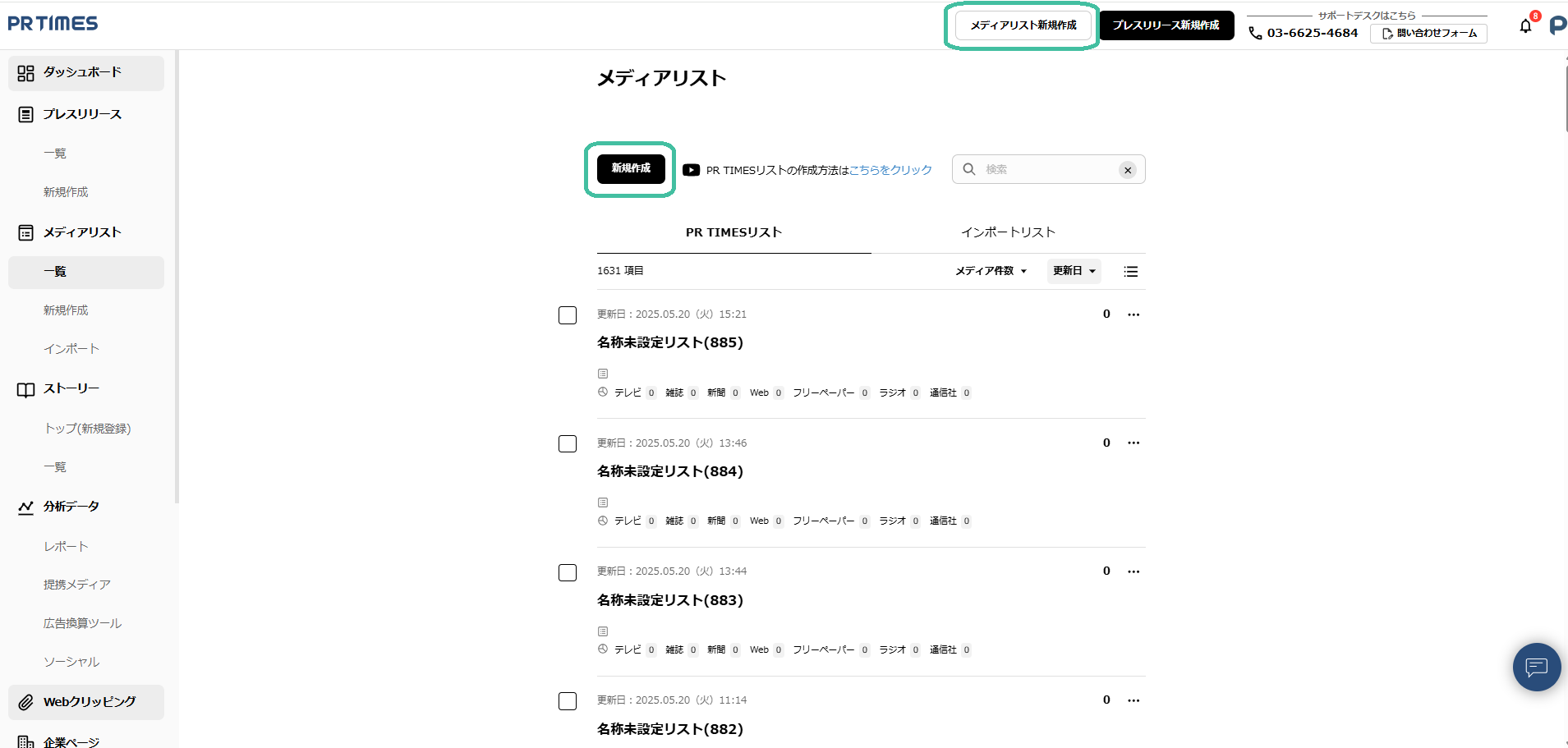 サイドメニューの「メディアリスト」≫「新規作成」、もしくは上部にあるボタン「メディアリスト新規作成」をクリックください。
