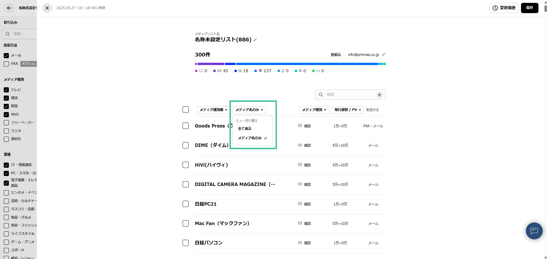 現在リストに選択済みのメディアの「メディア種別」(テレビ・雑誌・新聞・Web・フリーペーパー・ラジオ・通信社)の分布・比率を確認しながら、保存前の最終確認をされる際に、ぜひご活用ください。