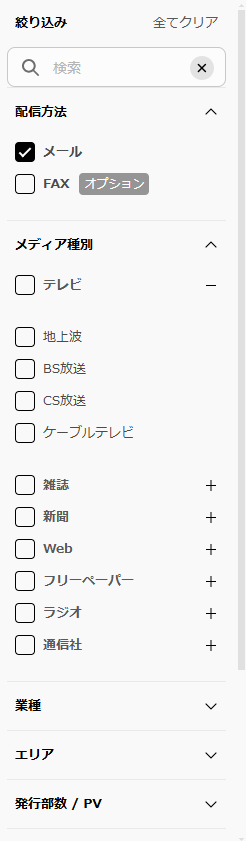 左側のサイドメニューから、フリーワードでのメディア検索や、チェックを入れた条件に合致するメディアの絞り込みを行うことが可能です。