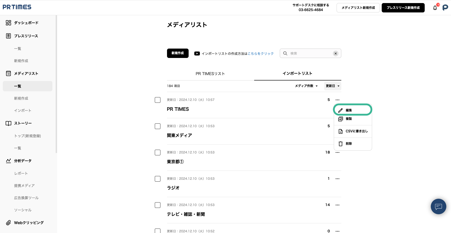 サイドメニューの「メディアリスト」≫「一覧」より、編集したいリストの三点リーダー「・・・」をクリックし「編集」を選択してください。