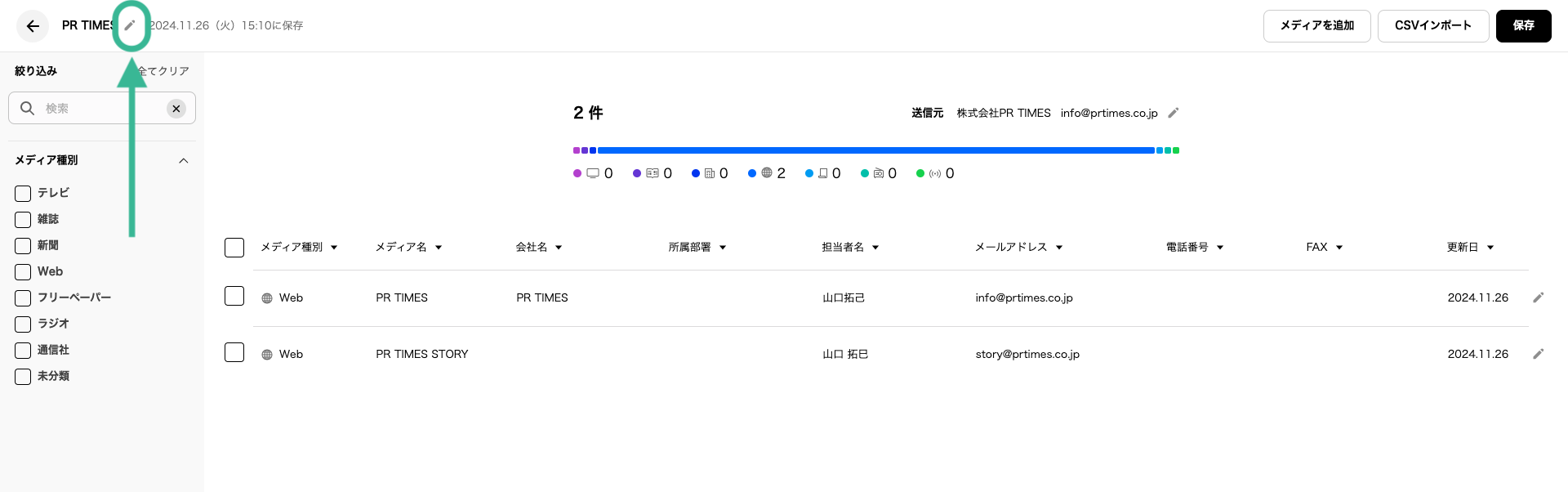 画面左上に表示されている、メディアリスト名の横にあるペンマークをクリックすると、リストの名称を変更することができます。