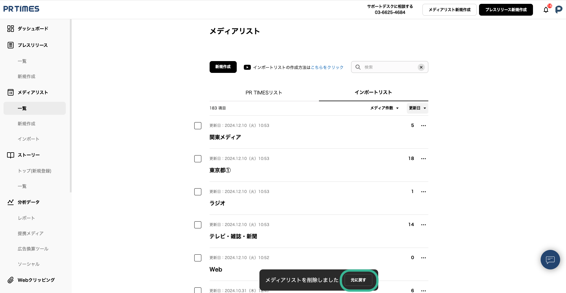 なお、「削除」をクリックすると、直後5秒間程は、下部に「メディアリストを削除しました(元に戻す)」という表示が出てきます。もし「誤って削除を押してしてしまった」等の場合は、「元に戻す」をクリックすると戻ります。