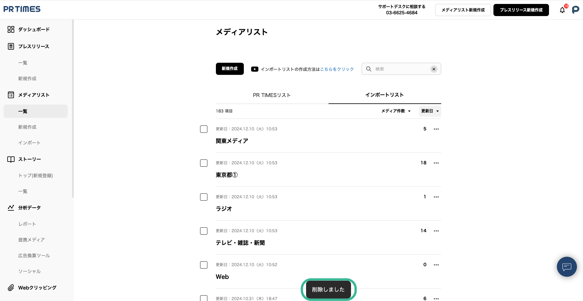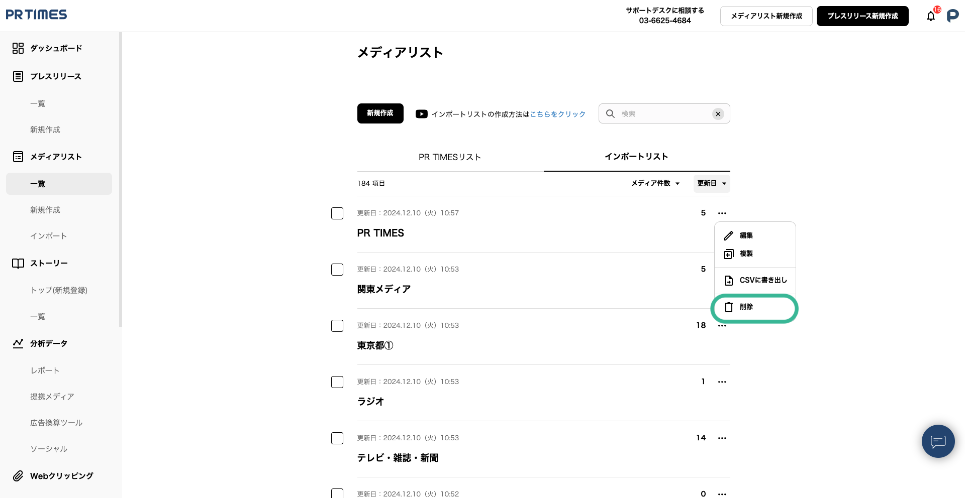 インポートリスト自体の削除を行う場合は、メディアリスト一覧から、削除したいリストの三点リーダー「・・・」をクリックし「削除」を選択してください。