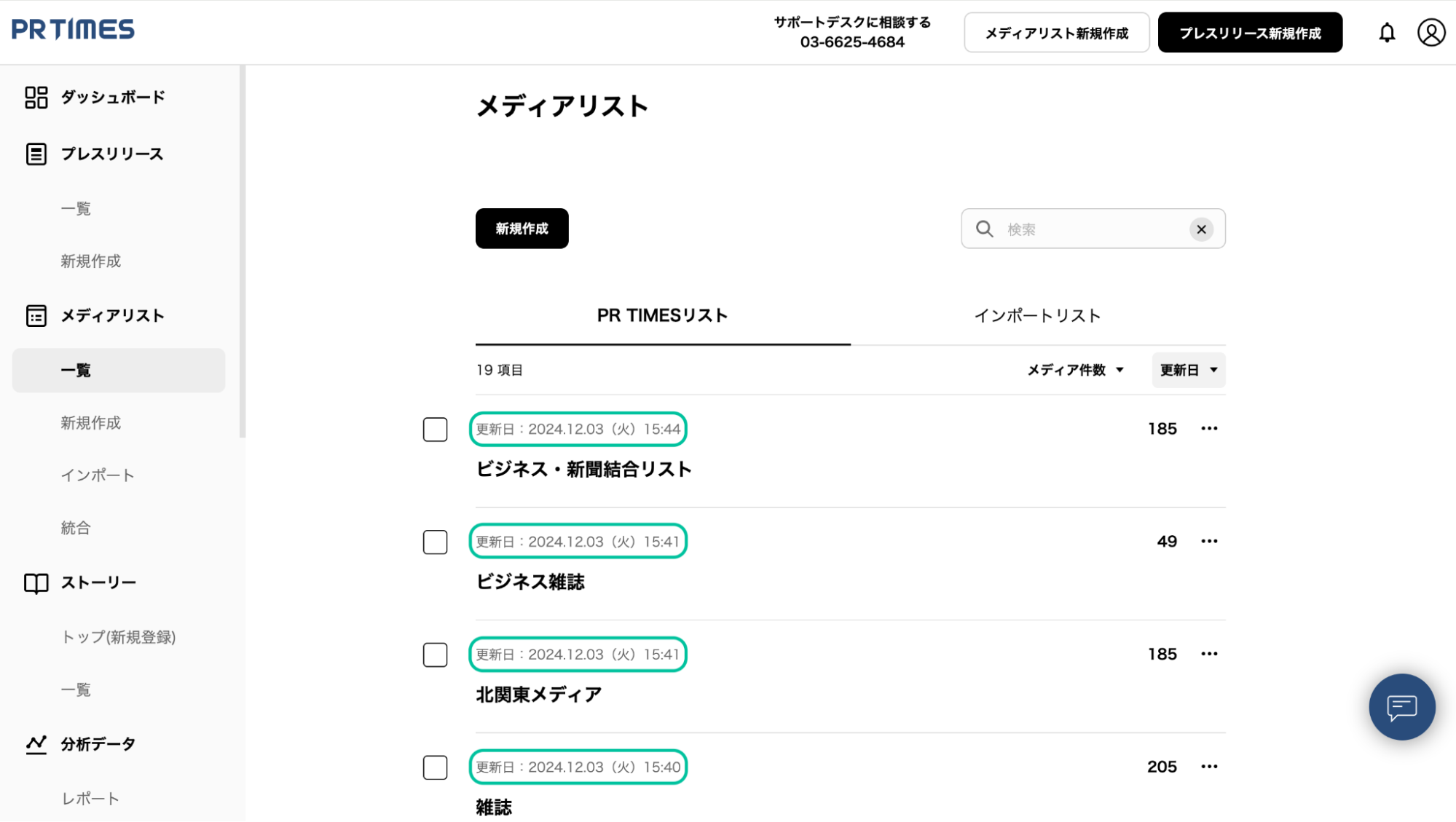 メディアリストを更新した日時が、メディアリストごとに一覧画面に表示され、全てのメディアリストの更新状況をご確認いただけます。