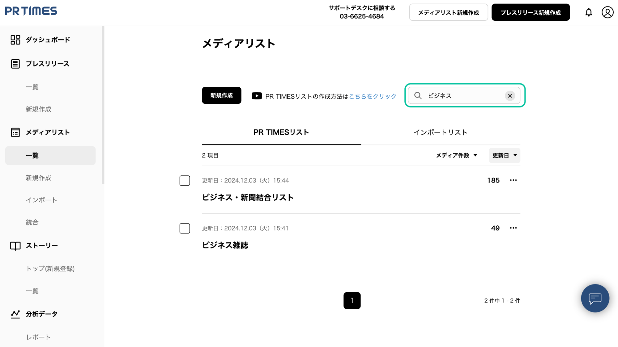 検索機能は、右上の検索窓にキーワードを入力し、メディアリスト名で検索をすることができます。