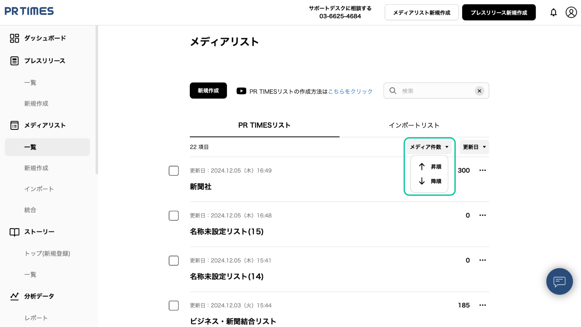 並び替えは、「メディア件数」「更新日」それぞれをクリックし、昇順・降順を選択してください。