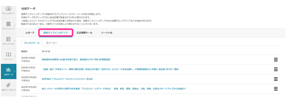 転載されたメディアのご確認は、企業向け管理画面のサイドメニューにある「分析データ」内の「提携オンラインメディア」よりご確認いただくことが可能です。