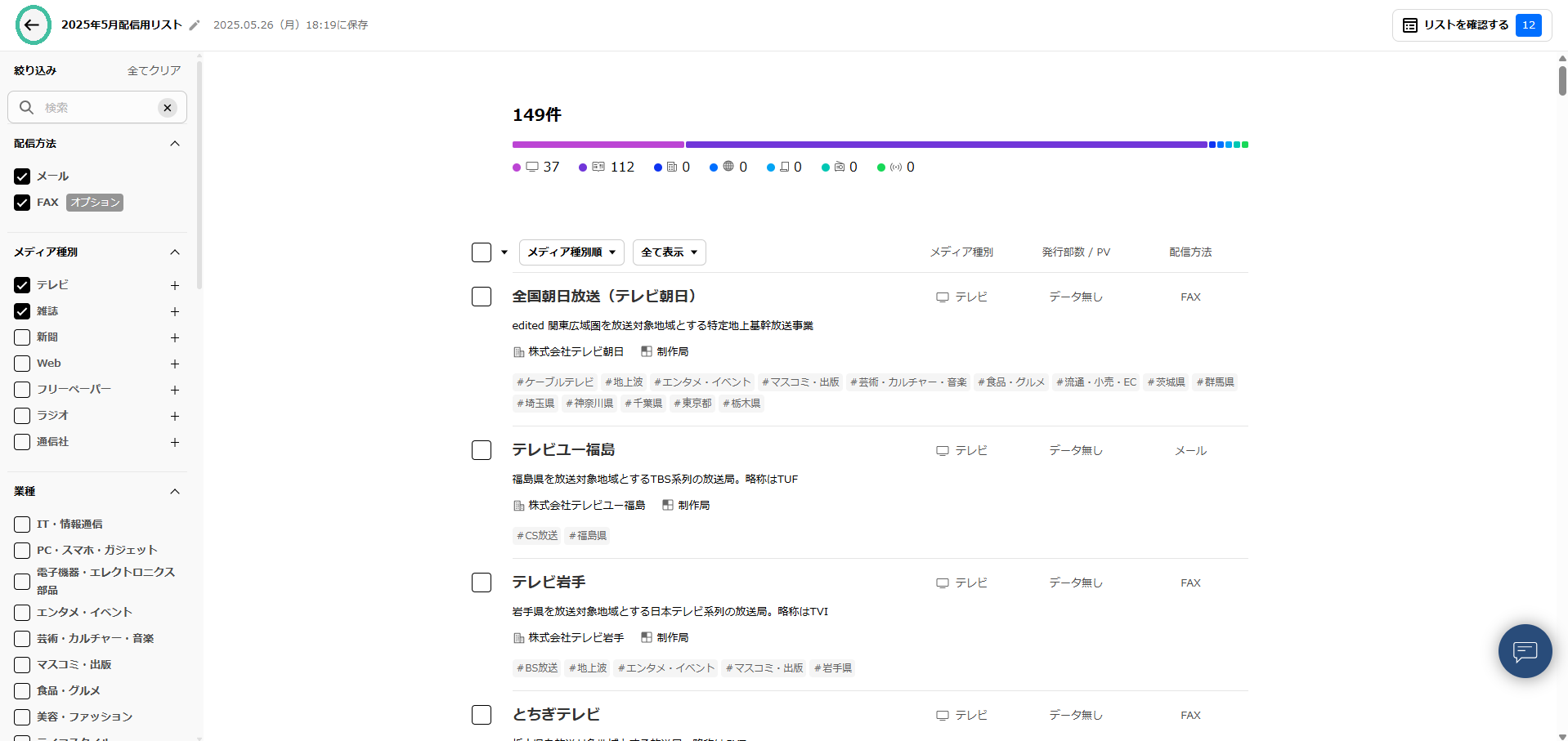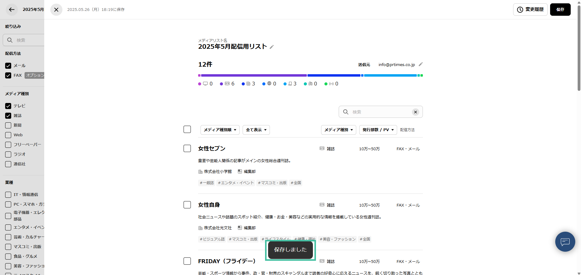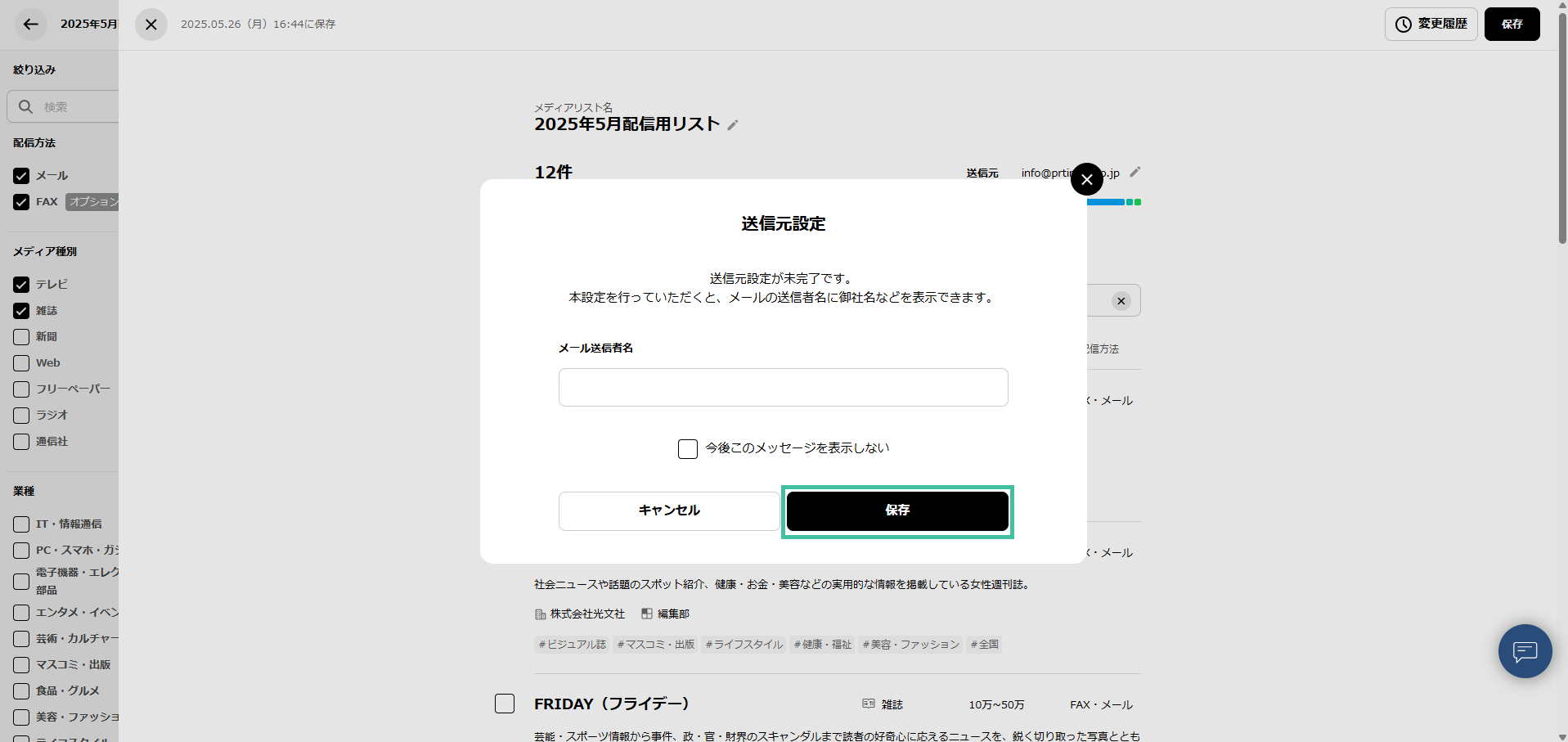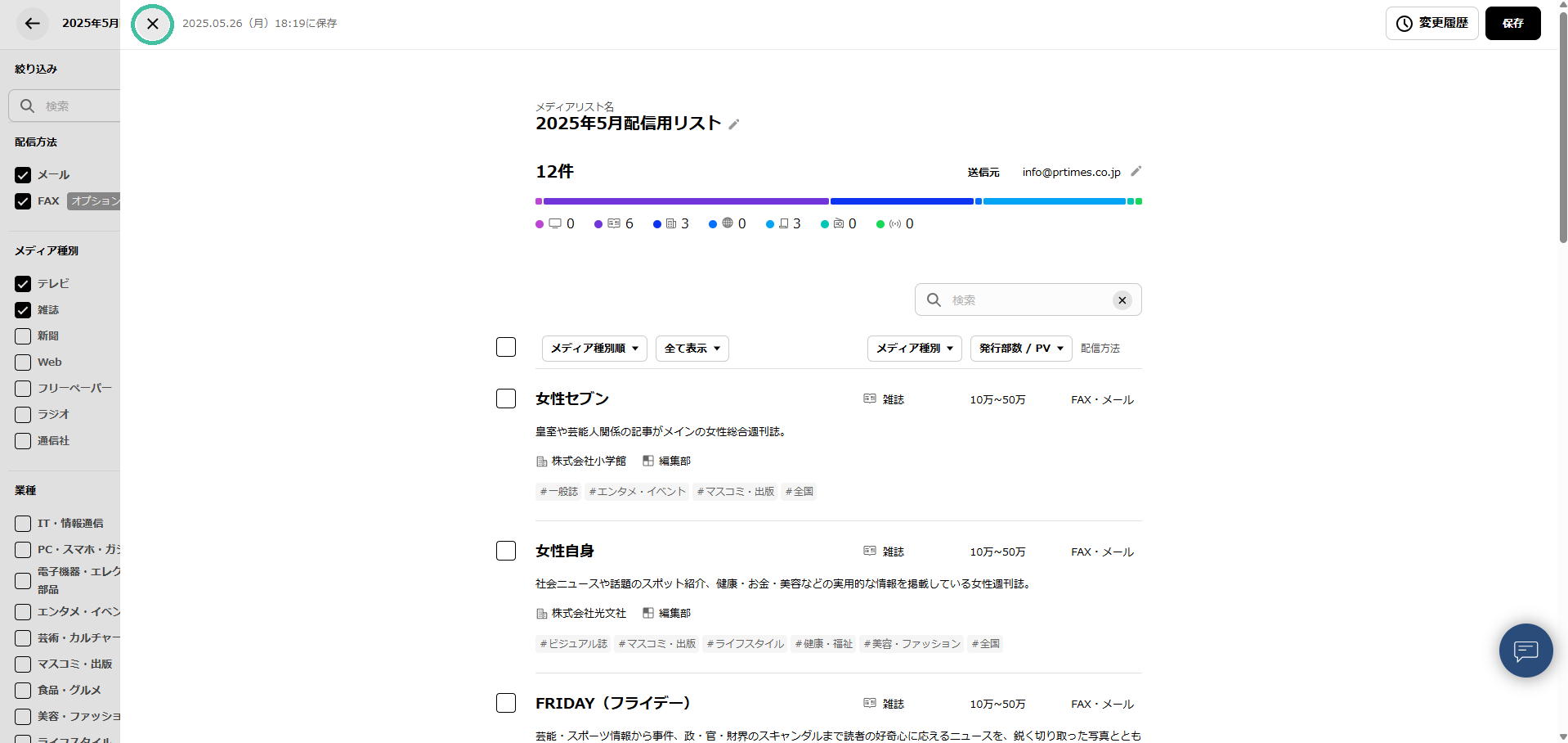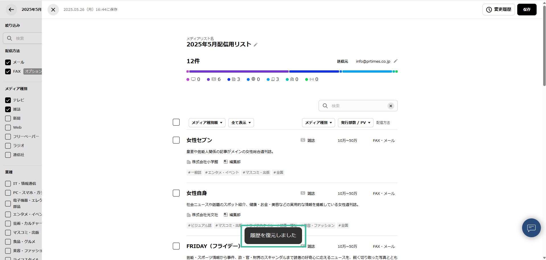 復元後、メディアリスト確認画面に戻りますので、右上の「保存」をクリックしてください。そうすると、復元した状態のメディアリストで改めて保存がされます。