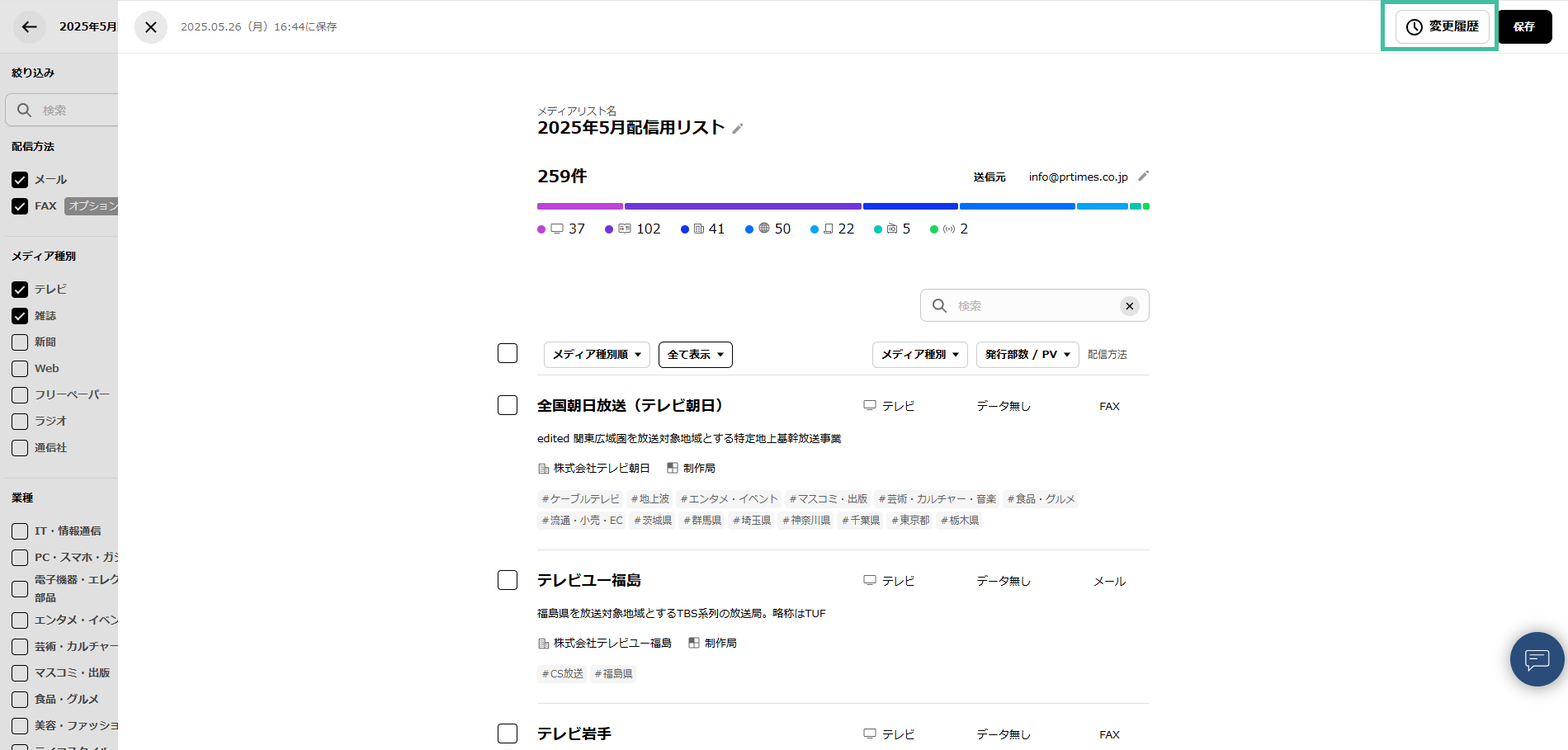 メディアリスト(PR TIMESリスト)の作成・編集時、リスト確認画面の右上にある「変更履歴」のボタンをクリックすると、そのリストの1ヵ月以内の変更履歴を確認することができます。
