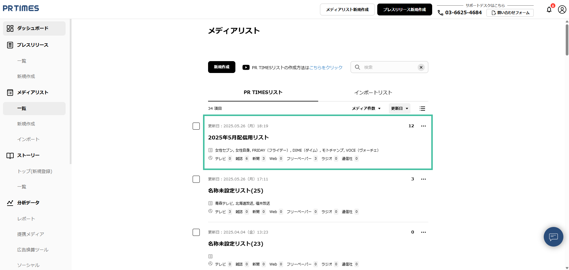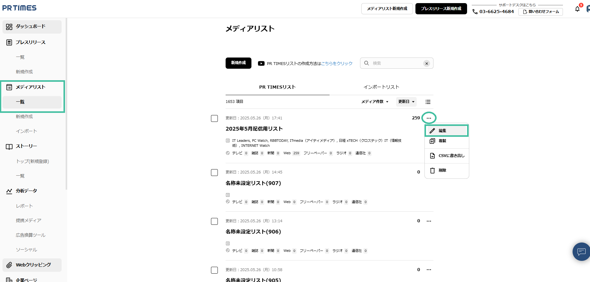 サイドメニューの「メディアリスト」≫「一覧」より、編集したいリストの三点リーダー「・・・」をクリックし「編集」を選択してください。