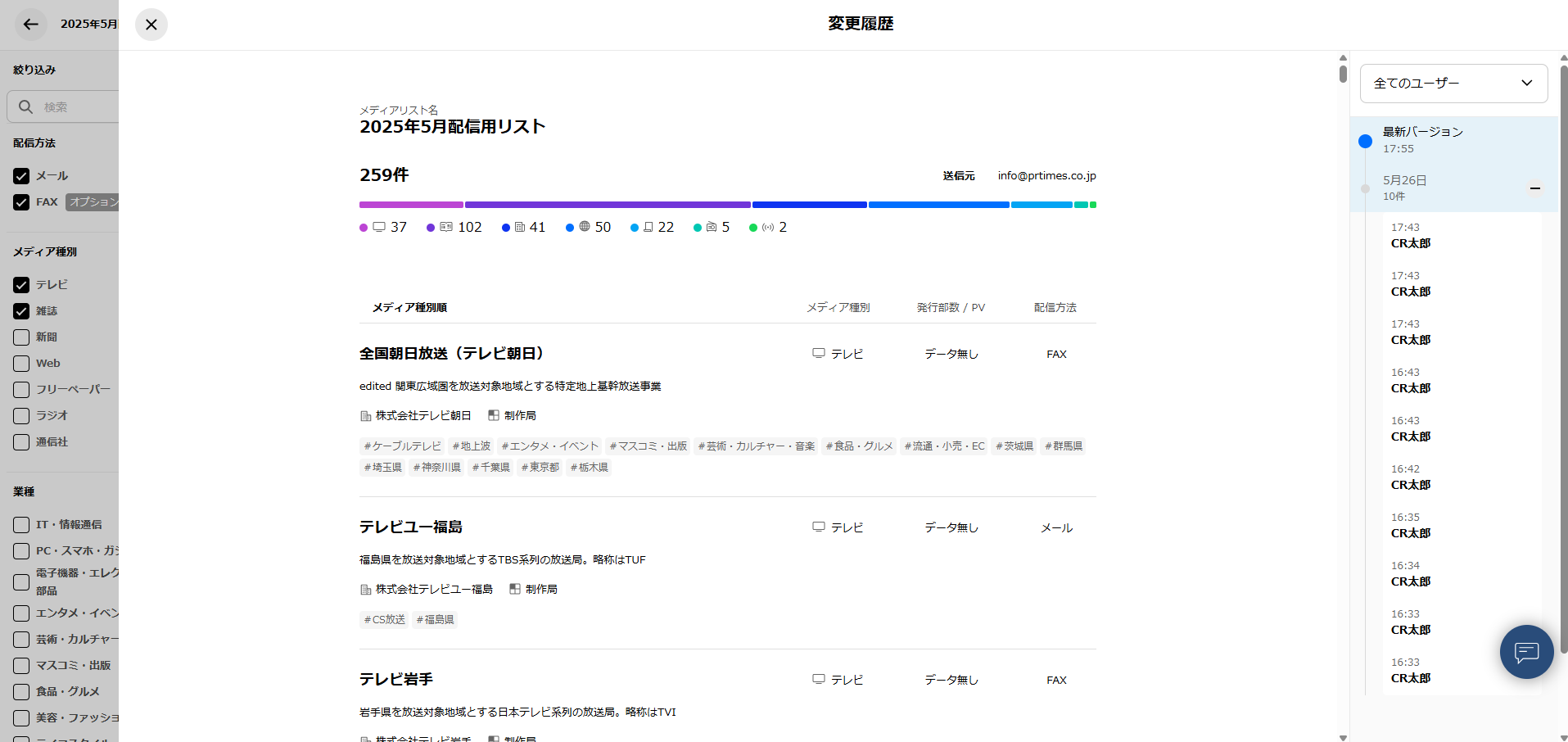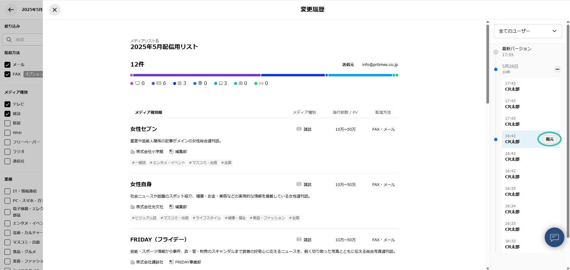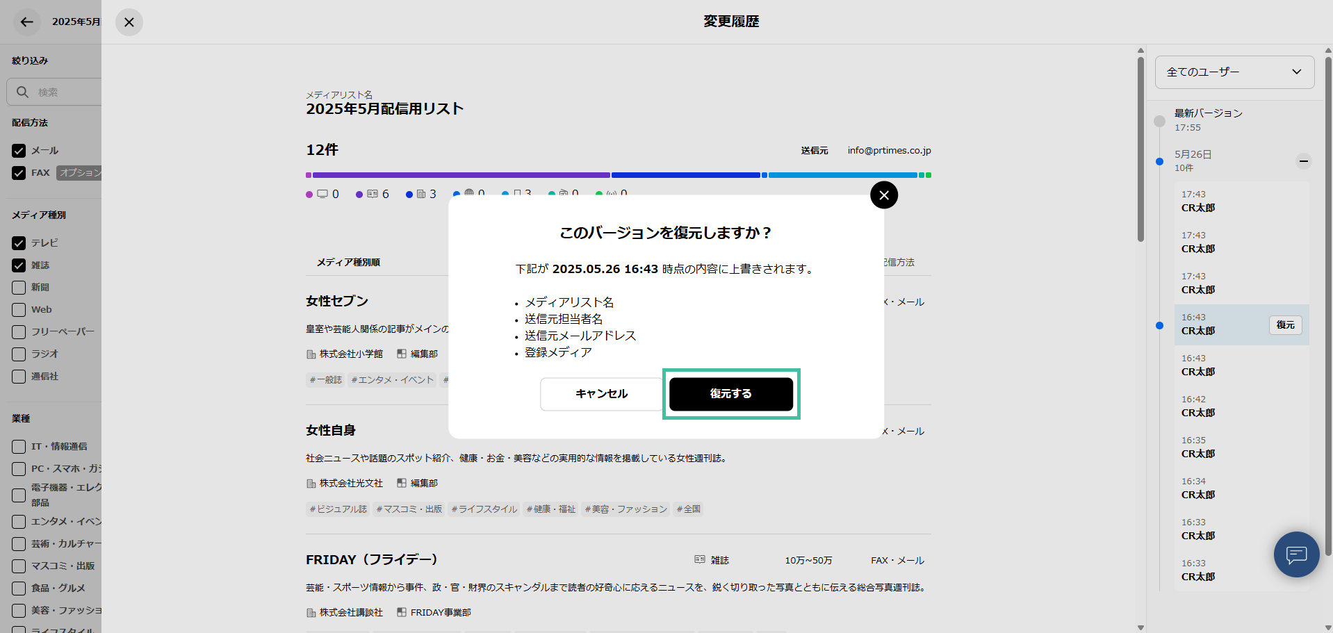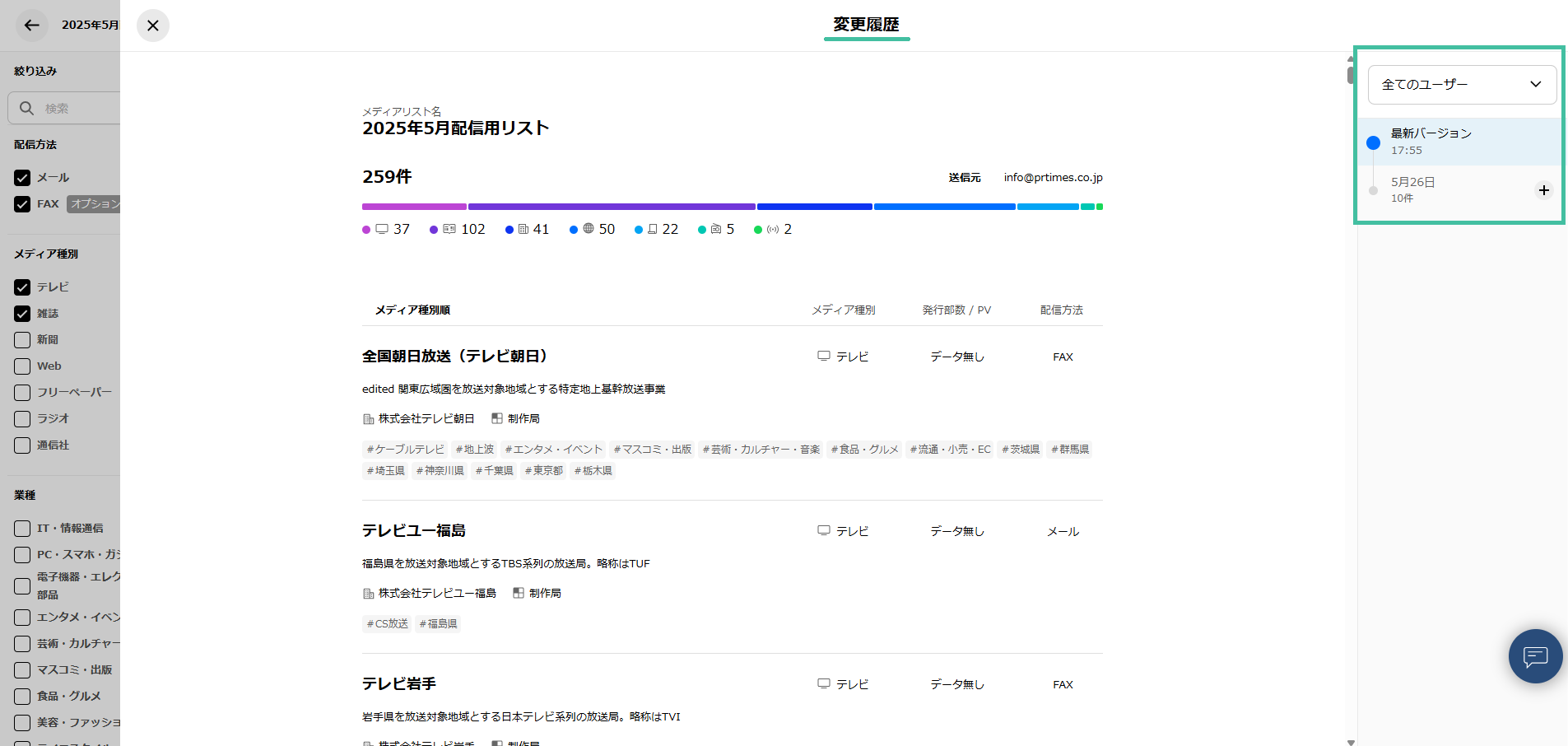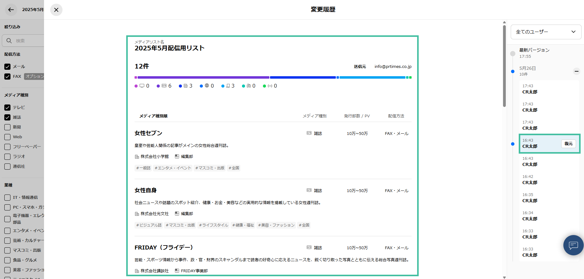確認したい変更履歴をクリックすると、左側にその当時のメディアリストの状態が表示されます。