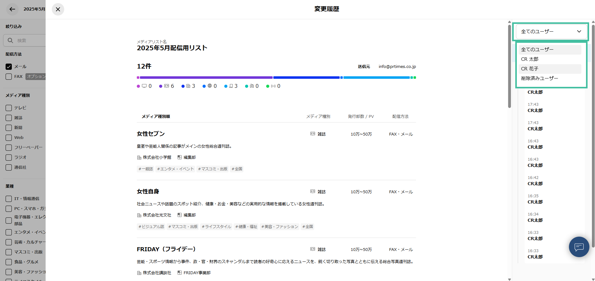 ※該当のメディアリストを変更したことのないユーザーも選択肢には表示されます。「どのユーザーがこのリストを変更していないか(=変更履歴がないか)ということもご確認いただくことが可能です。