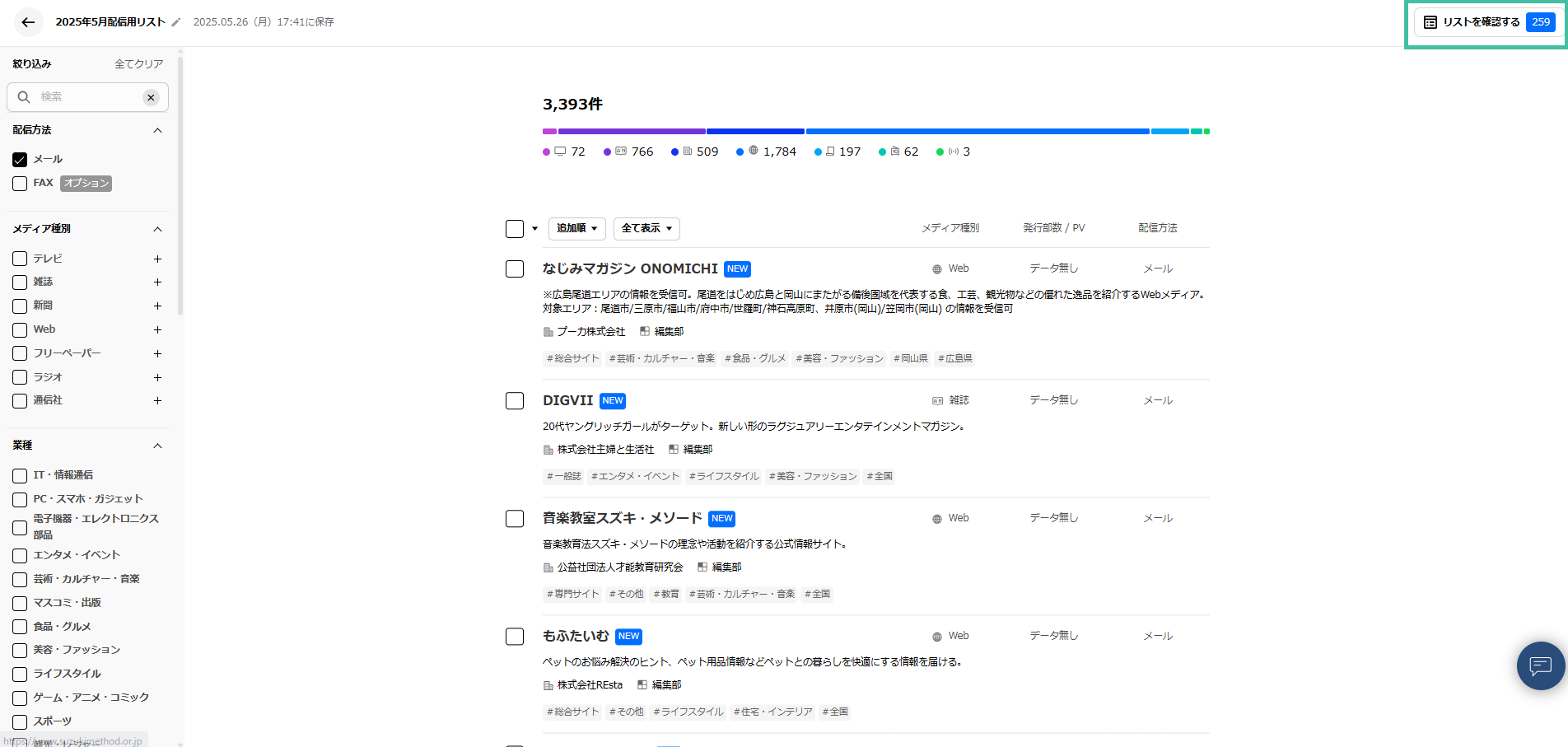 メディア検索画面の右上にある「リストを確認する」をクリックください。