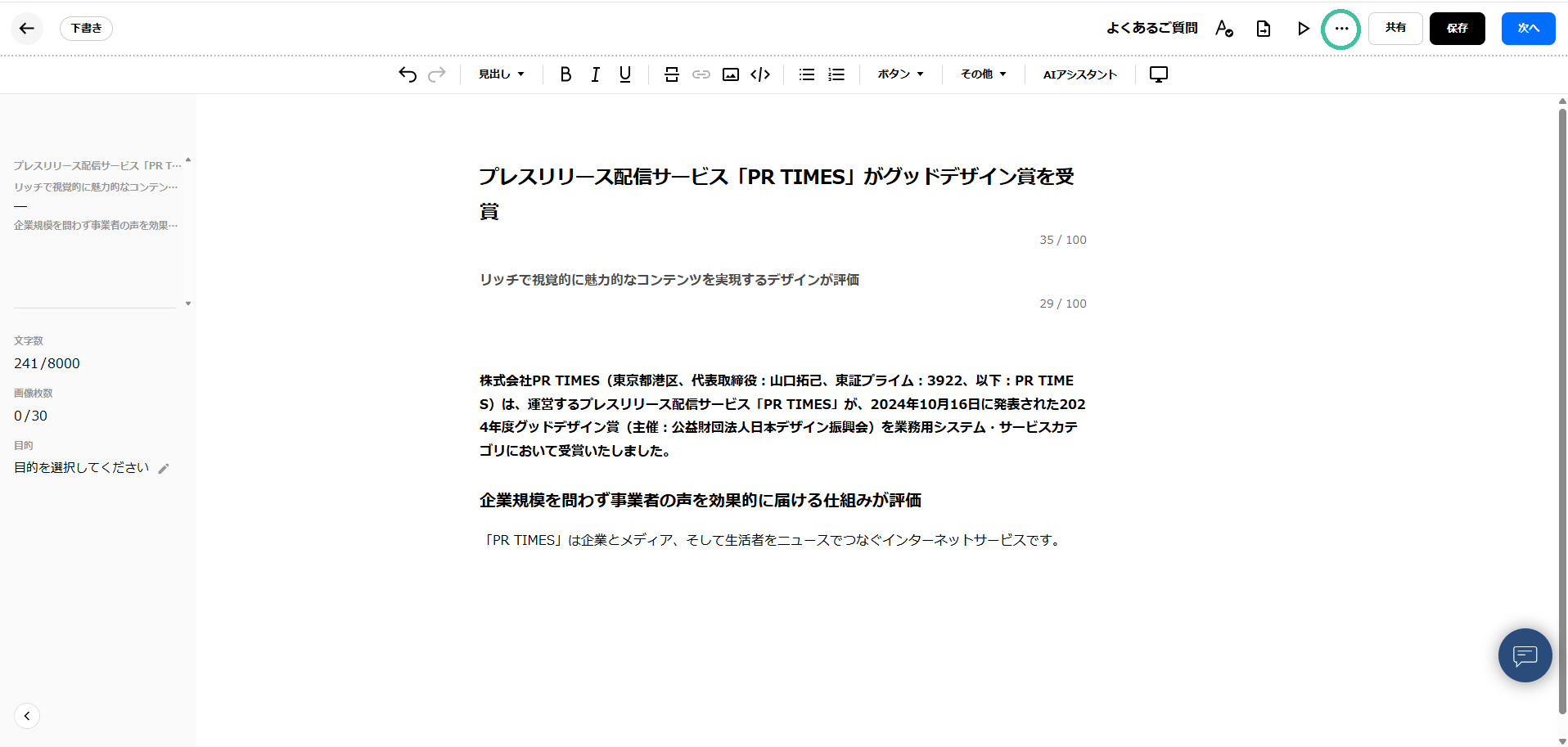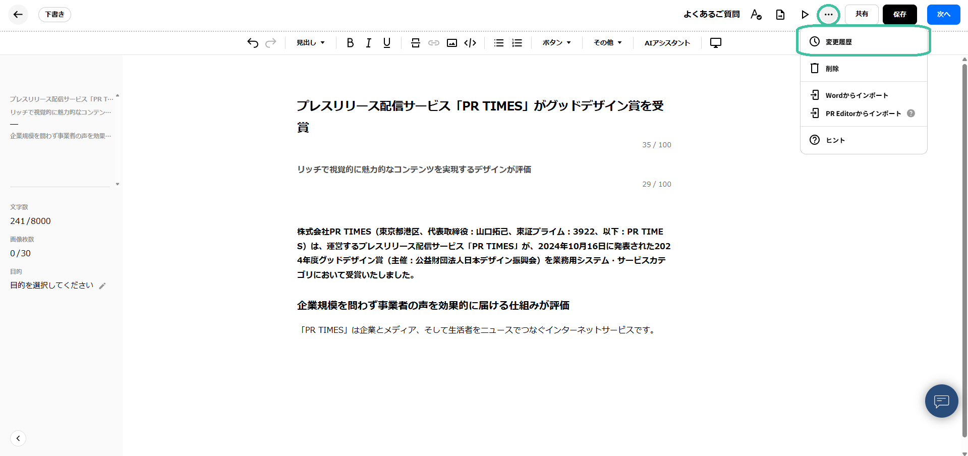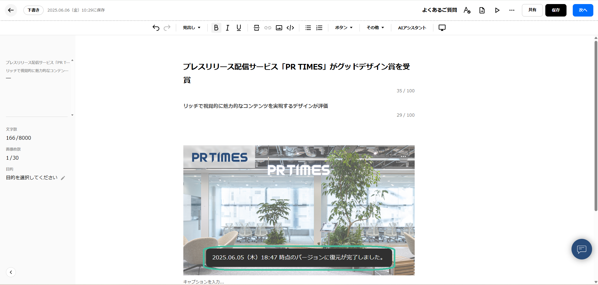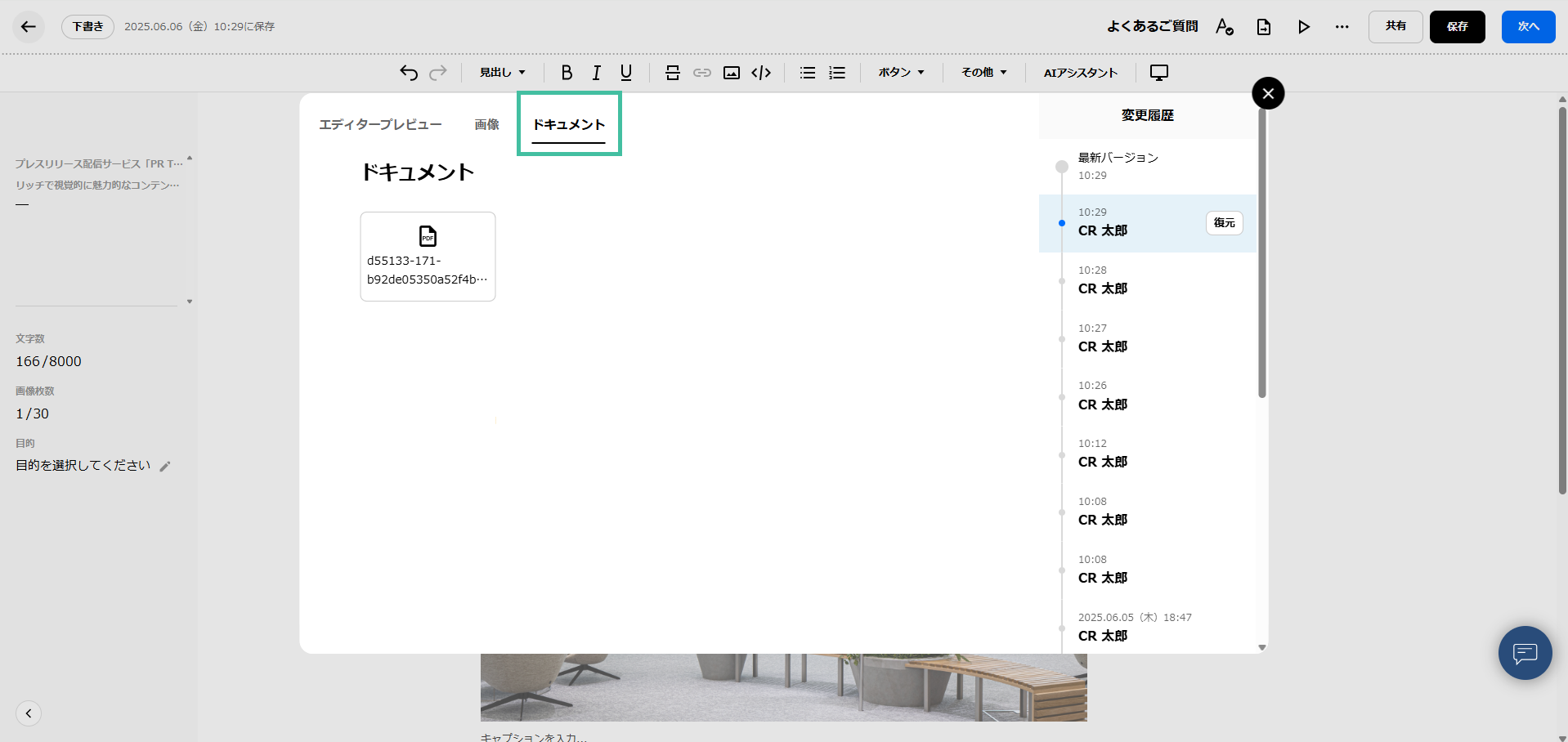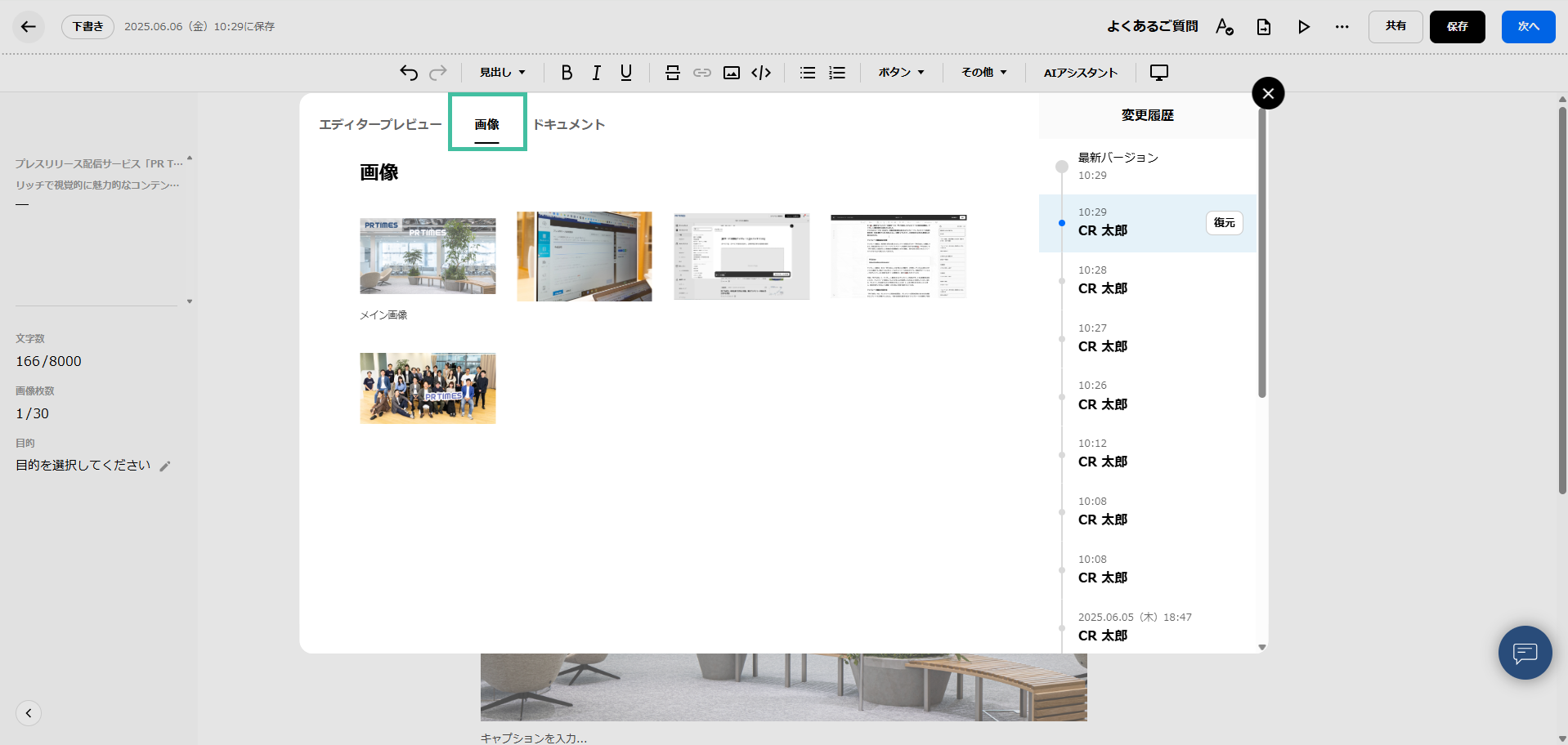 プレスリリース編集中は、自動的に、2分に1回、履歴が保存されます。