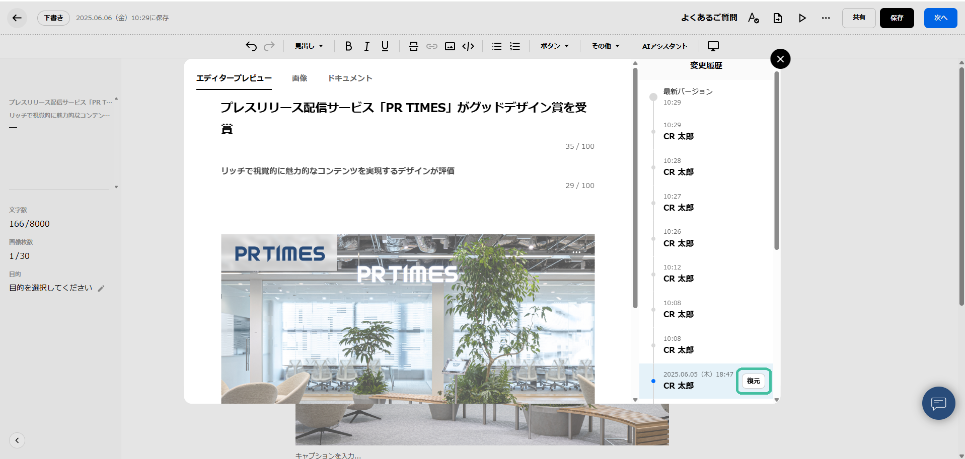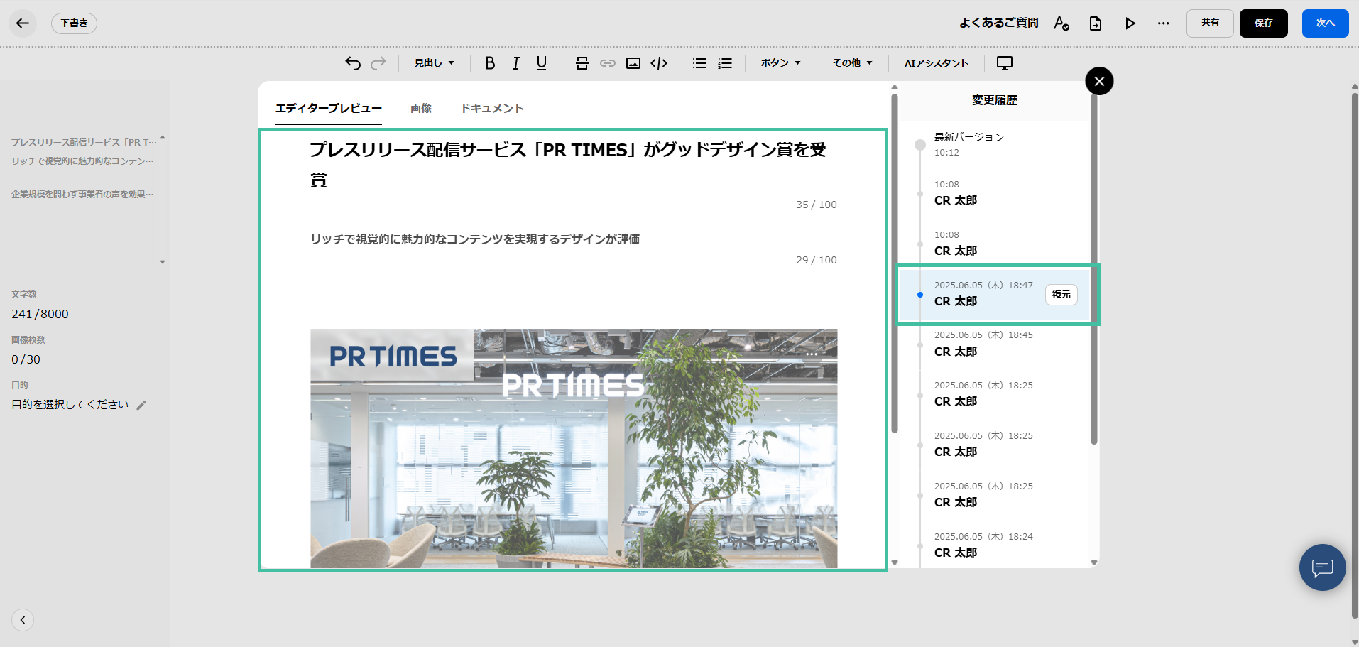 プレスリリースを作成中に、変更履歴(過去の編集情報)を確認したり、過去の状態へ復元することができます。