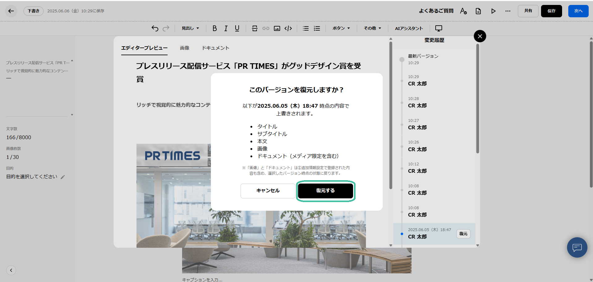 上記の「復元」は、「プレスリリース編集中における変更履歴」の復元のみとなります。予めご注意ください。