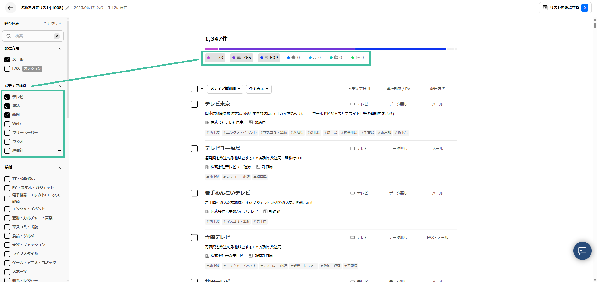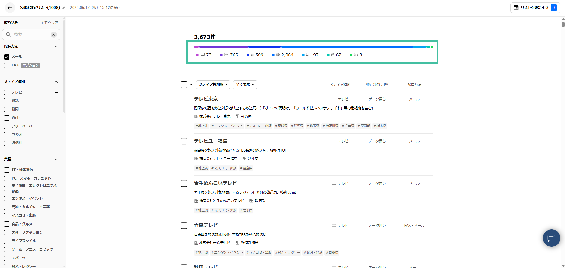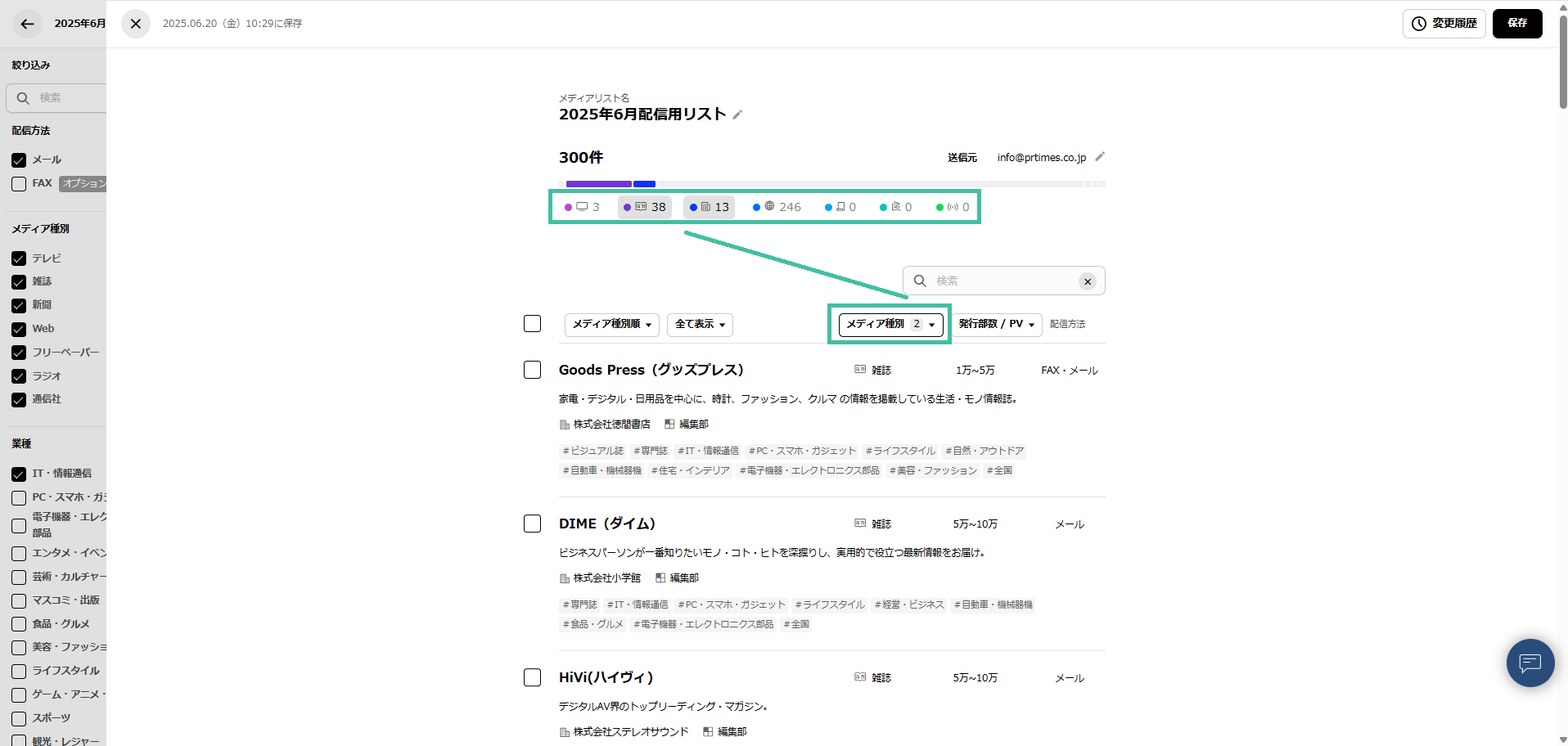 現在表示されているメディアの「メディア種別」(テレビ・雑誌・新聞・Web・フリーペーパー・ラジオ・通信社)の分布・比率を確認しながら、プレスリリース配信先のメディアをお選びいただく際に、ぜひご活用ください。