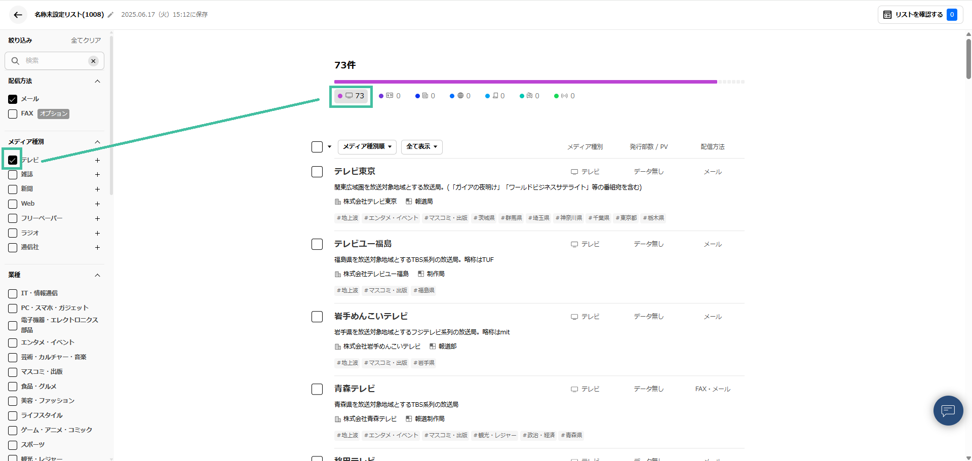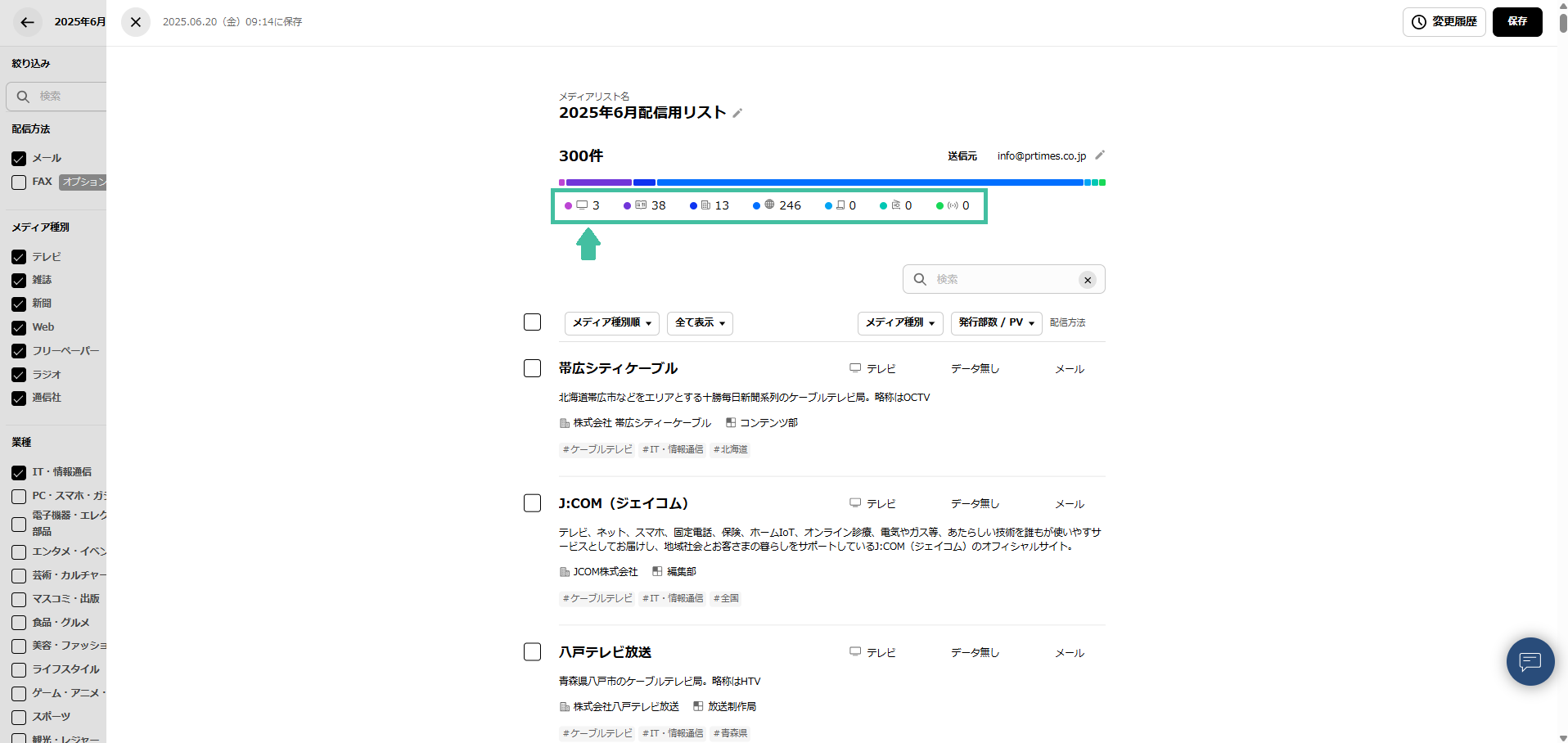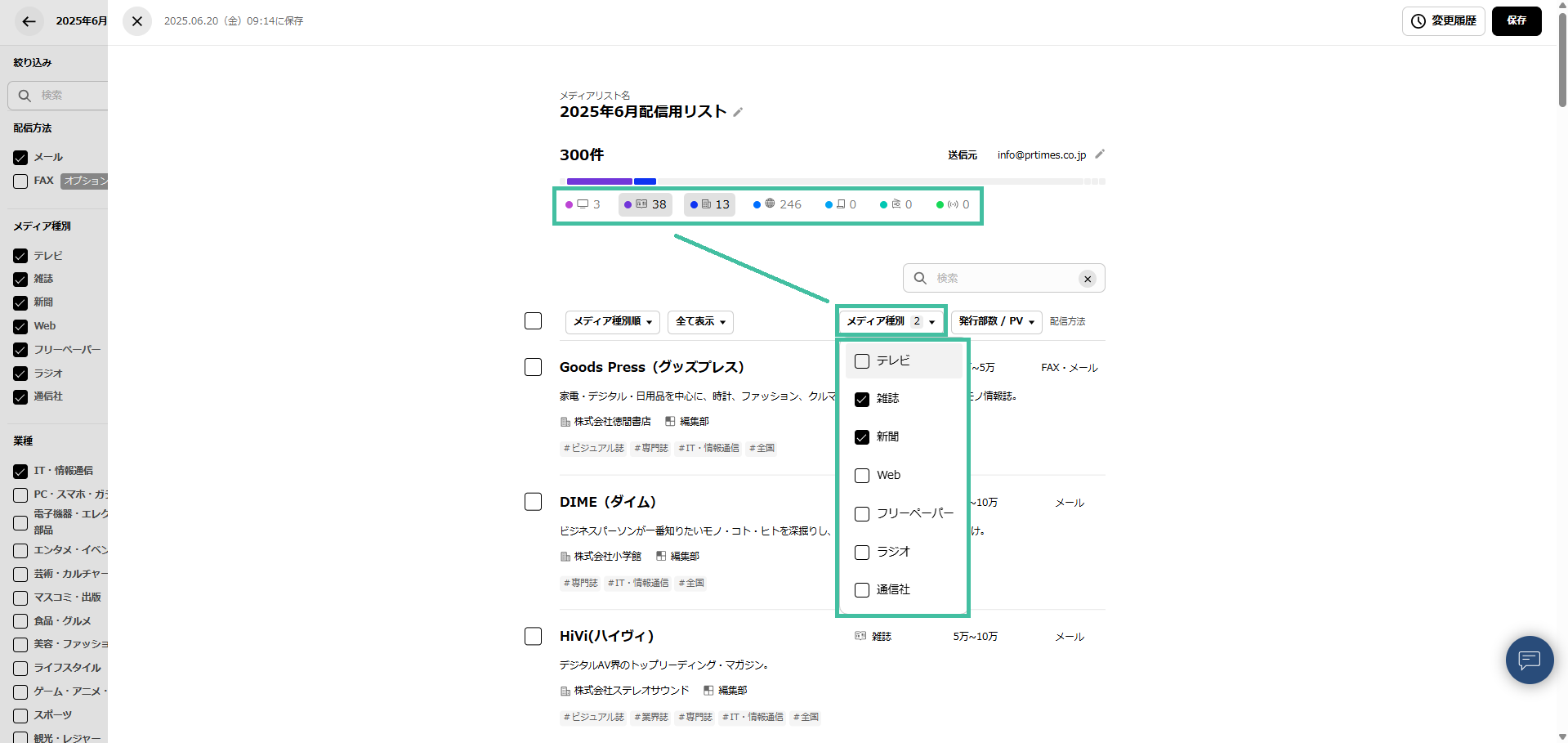 現在表示されているメディアの「メディア種別」(テレビ・雑誌・新聞・Web・フリーペーパー・ラジオ・通信社)の分布・比率を確認しながら、プレスリリース配信先のメディアをお選びいただく際に、ぜひご活用ください。