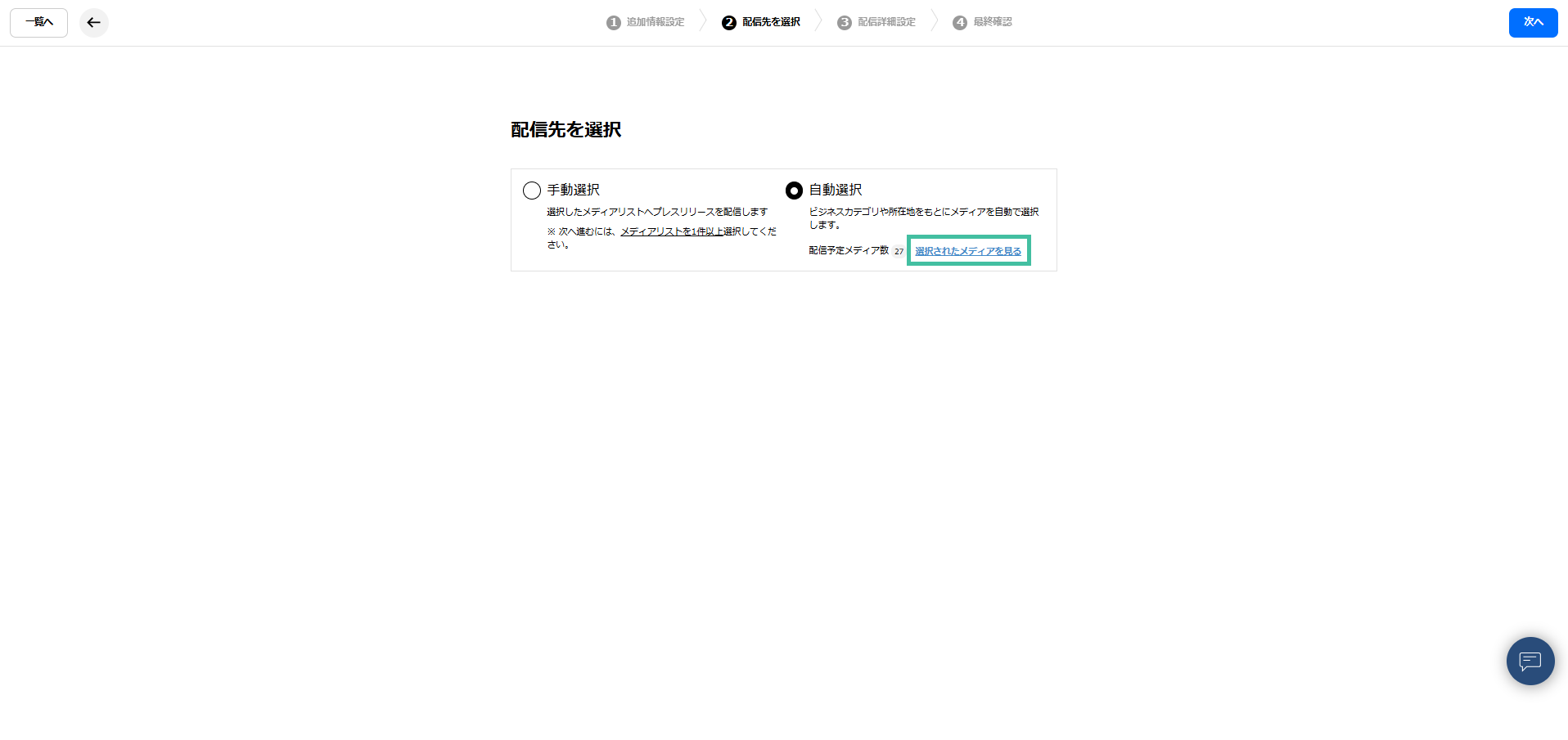 - プレスリリース入稿画面>「②配信先を選択」>「自動選択」を選択した際の「選択されたメディアを見る」(*3)