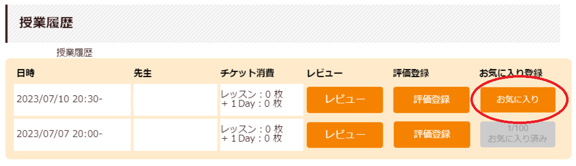 2. 授業履歴の「お気に入り登録」を押下して登録または解除する