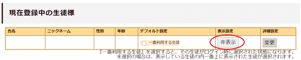 3.「現在登録中の生徒様」の一覧より、非表示にしたい生徒様の情報の右隣にある「非表示」ボタンを押下