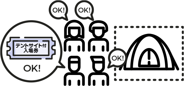 テントサイトを利用するグループ内の1名がテントサイト付通し入場券をお持ちなら、同行するテントサイト利用者は入場券のみでご利用いただけます。