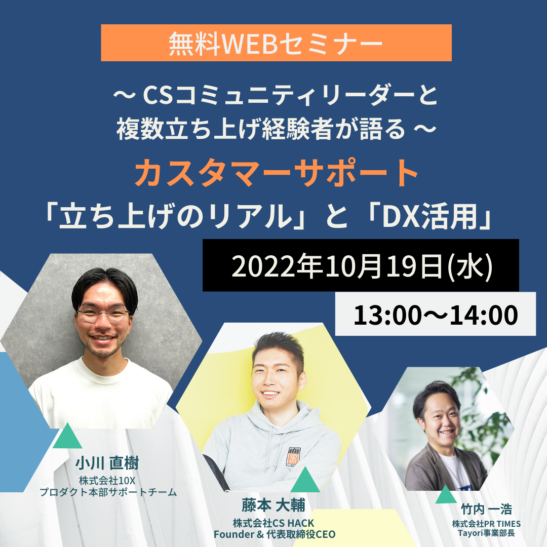 カスタマーサポート業界に特化したビジネスを展開、数千人規模のカスタマーサポートコミュニティを運営する「株式会社CS HACK」代表取締役CEO藤本大輔氏と、大小さまざまなスタートアップでカスタマーサポートの立ち上げやマネジメントやコミュニティ運営、複数社のカスタマーサポート支援なども行う「株式会社10X 」小川直樹氏の2名をスピーカーとして迎えた、共催セミナーです。