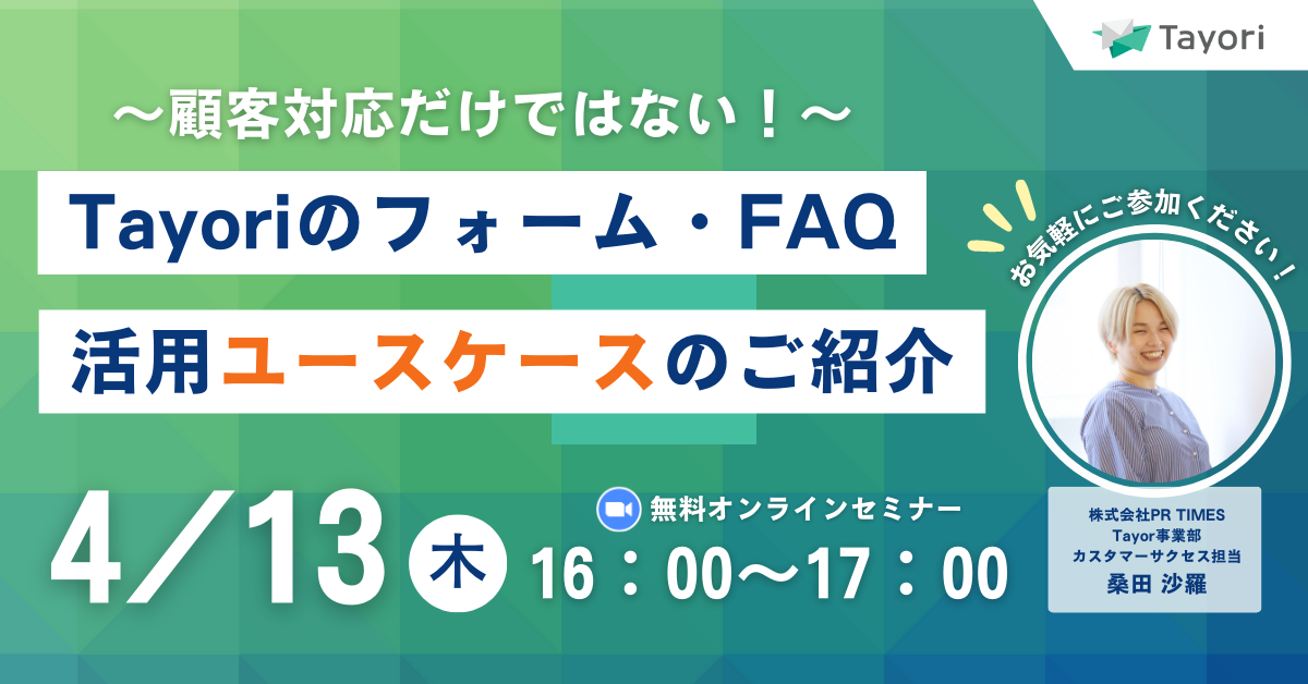 本セミナーでは、Tayori カスタマーサクセスの担当者が、事例を元にTayoriを活用した様々なケースをフォーム・FAQ(よくある質問)機能を中心にご紹介します。カスタマーサポートのみならず、マーケティング・営業・採用人事への活用など、新しい活用のヒントをご案内します。