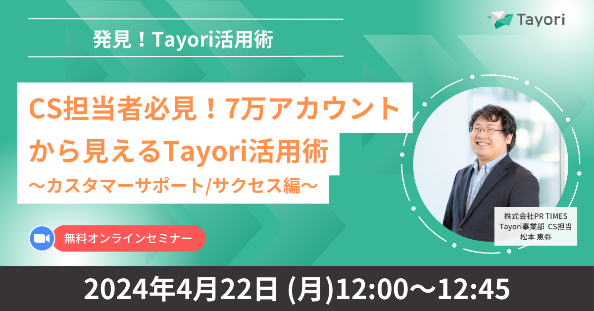 本セミナーでは、7万アカウントがあるTayoriの中で、カスタマーサポート/サクセス施策で有効に活用しているパターンから、Tayoriの効果的な活用方法をご紹介いたします。