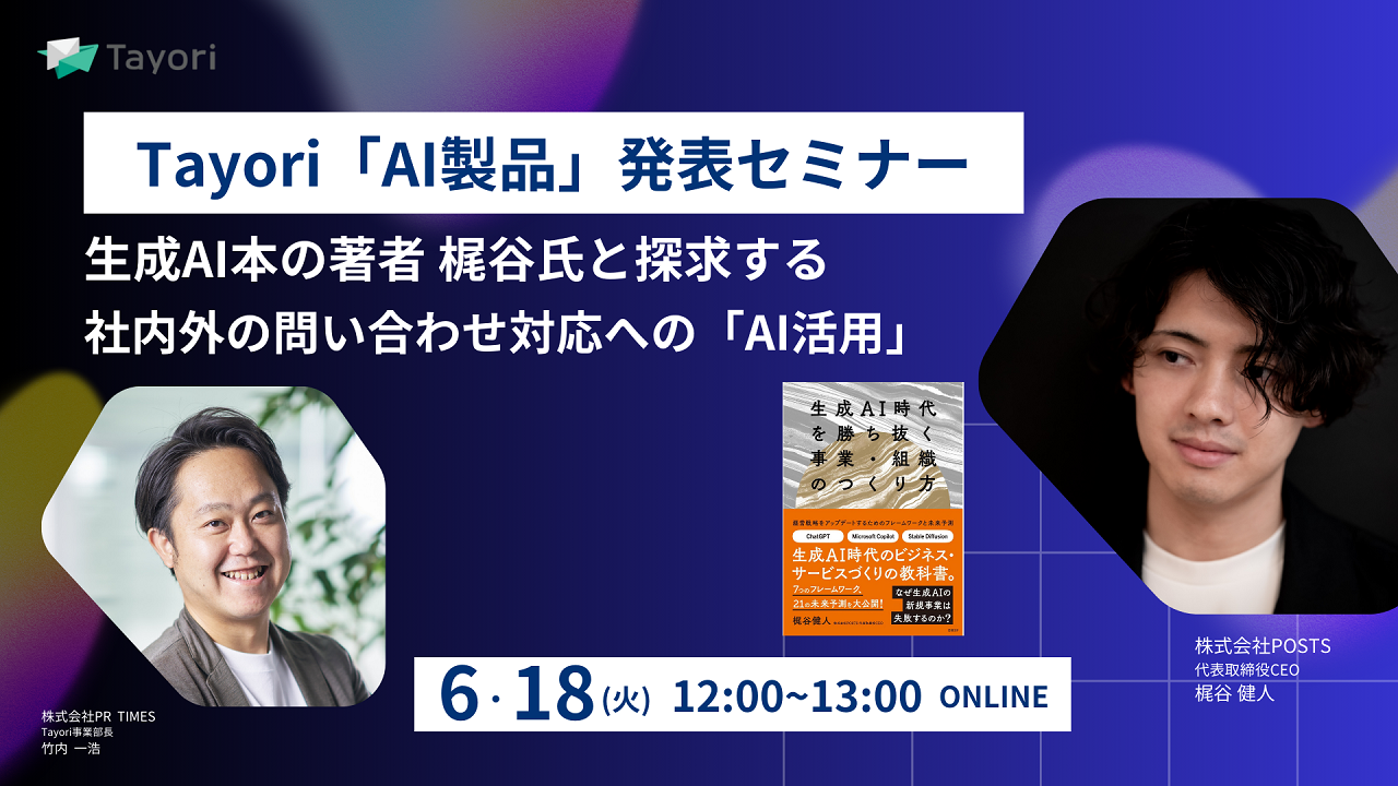 社内外の問い合わせ対応に生成AIを導入することによって、顧客体験がどのように変化し生産性を向上させていくのかを、海外含めたトレンドや生成AIを導入する際のポイント・リスクも交えて、株式会社PR TIMES Tayori事業部長の竹内とのパネルディスカッション形式で探求していきます。