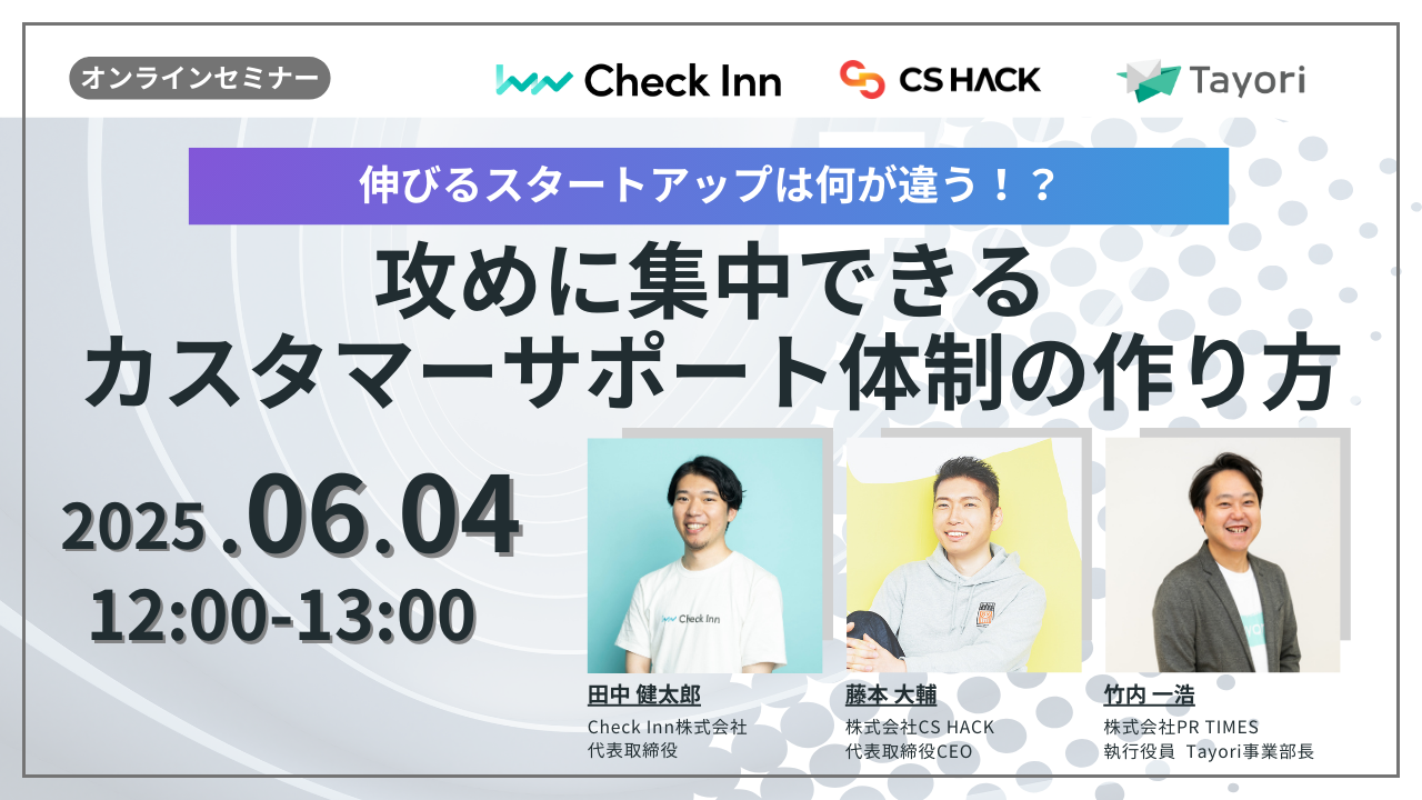 また、実際にTayoriを導入いただいたCheck Inn株式会社代表取締役 田中健太郎氏より、カスタマーサポートで抱えていた課題と、その解決方法や体制の作り方について、リアルな体験談をお話しいただきます。