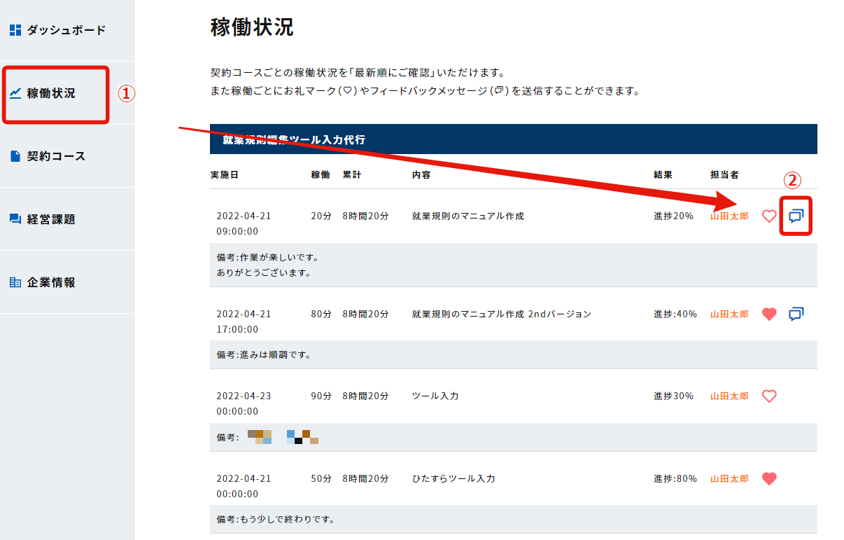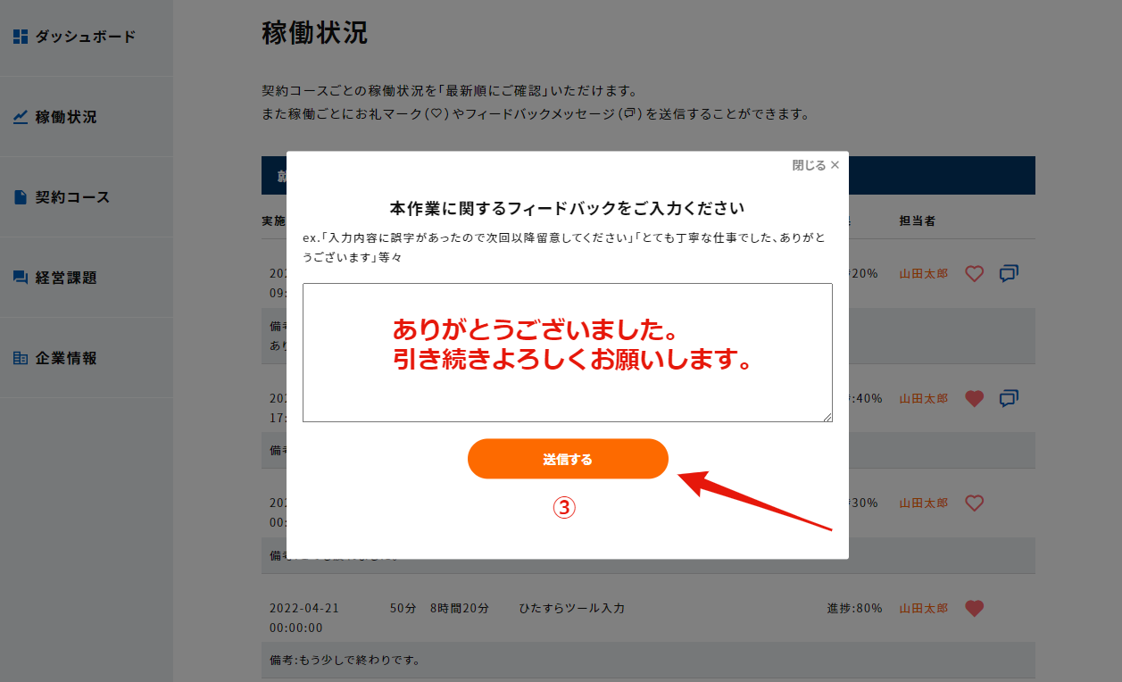 ・稼働ごとに、担当者名の右にあるお礼マーク(♡)を送信することもできます