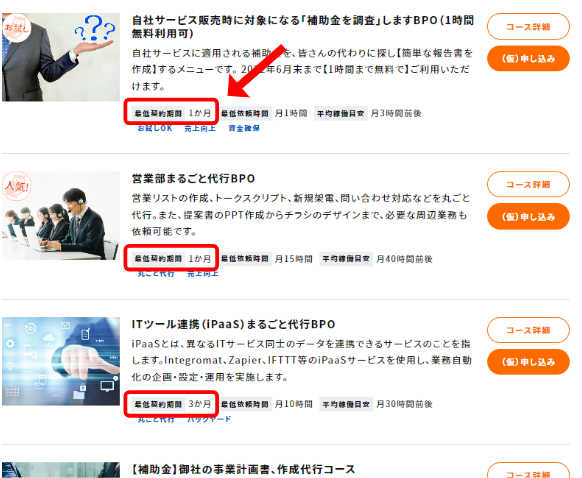詳しくは、コース一覧の「最低契約期間」横の日数をご確認ください!