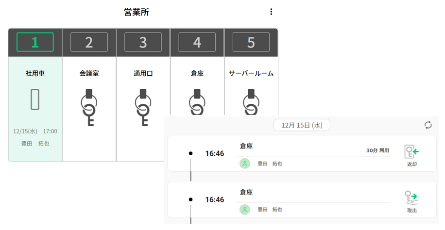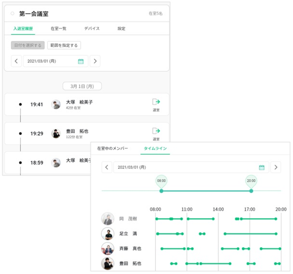 人の出入りを厳密に管理するだけでなく、そのログをアイコンやカード形式でグラフィカルに表示します。同僚の所在や部屋の利用状況が見える化され、日常の様々なシーンで気軽に利用できます。