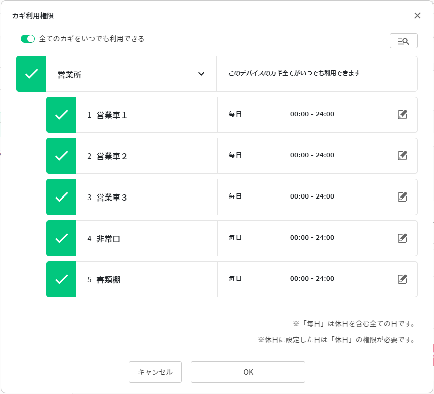 カギ利用権限の「設定する」をクリックすると、設定画面が開きます。