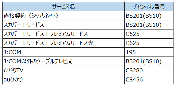 ※2025年1月10日より、BS200からBS201にチャンネル番号が変わりました。