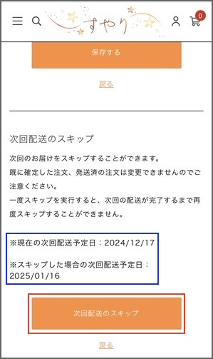 3.青枠の箇所に「次回配送予定日」、「スキップ後の次回配送予定日」が表示されるので、問題なければ「次回配送のスキップ」を選択します。