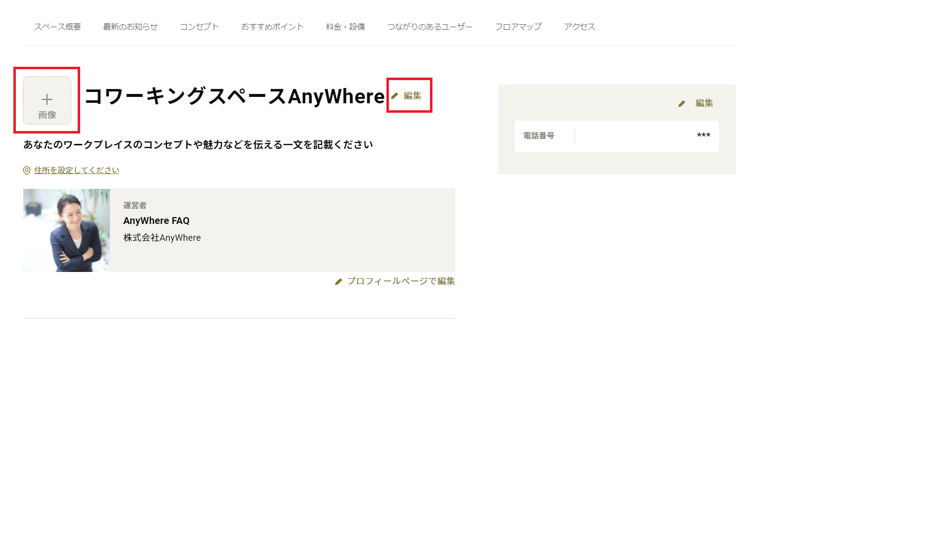 3.2.と同様に、最新のお知らせ、コンセプト、おすすめポイント、料金・設備、フロアマップ、アクセスを編集