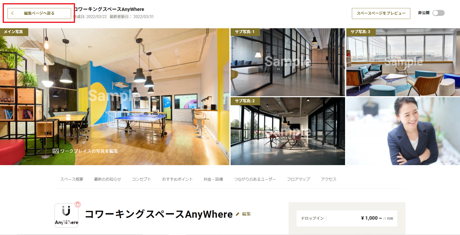1.スペースの編集が完了したら「編集ページへ戻る」をクリック