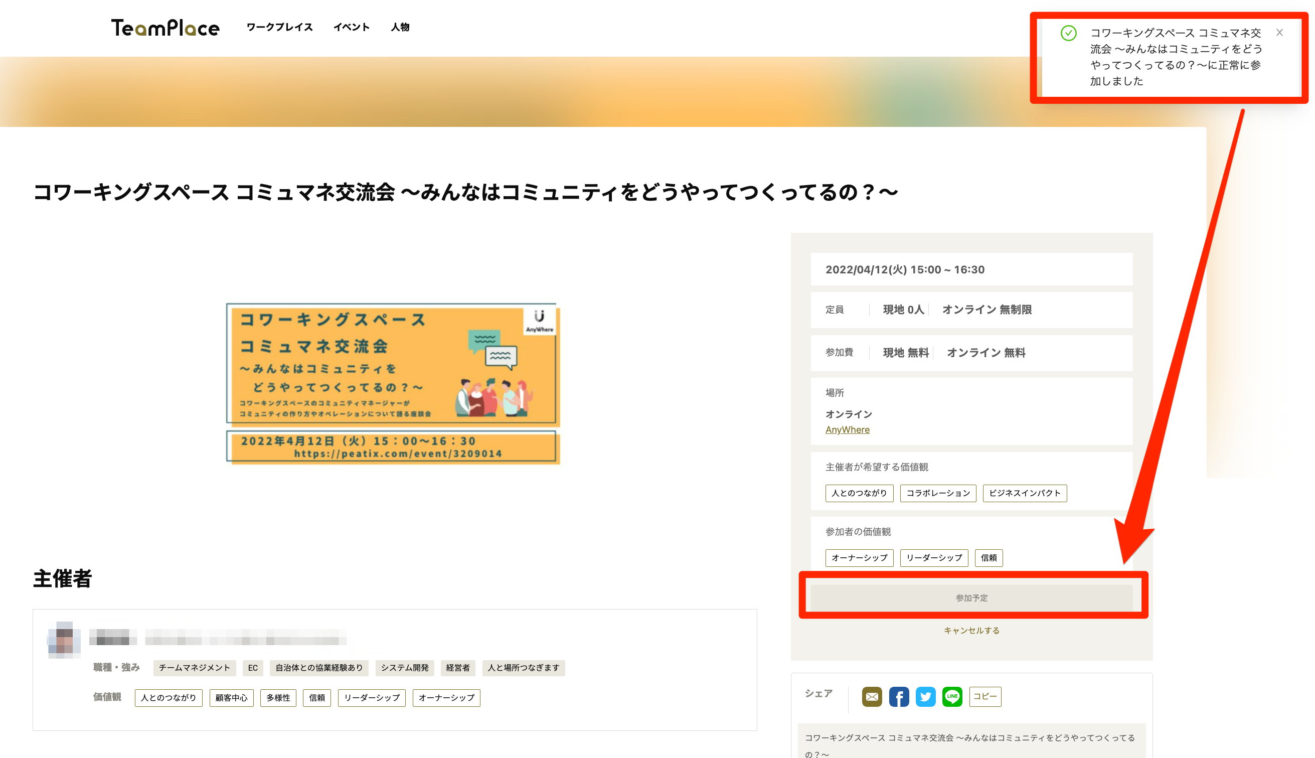 ※「参加する」ボタンはTeamPlace上での参加の意思表明となるもので、お申し込みには別途「申し込み先URL」からの申込が必要な場合があります