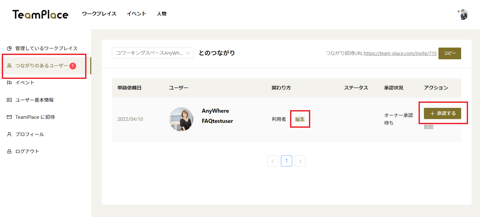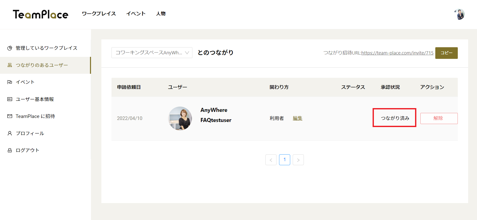 つながったユーザーは、ワークプレイスのつながり欄に表示されます